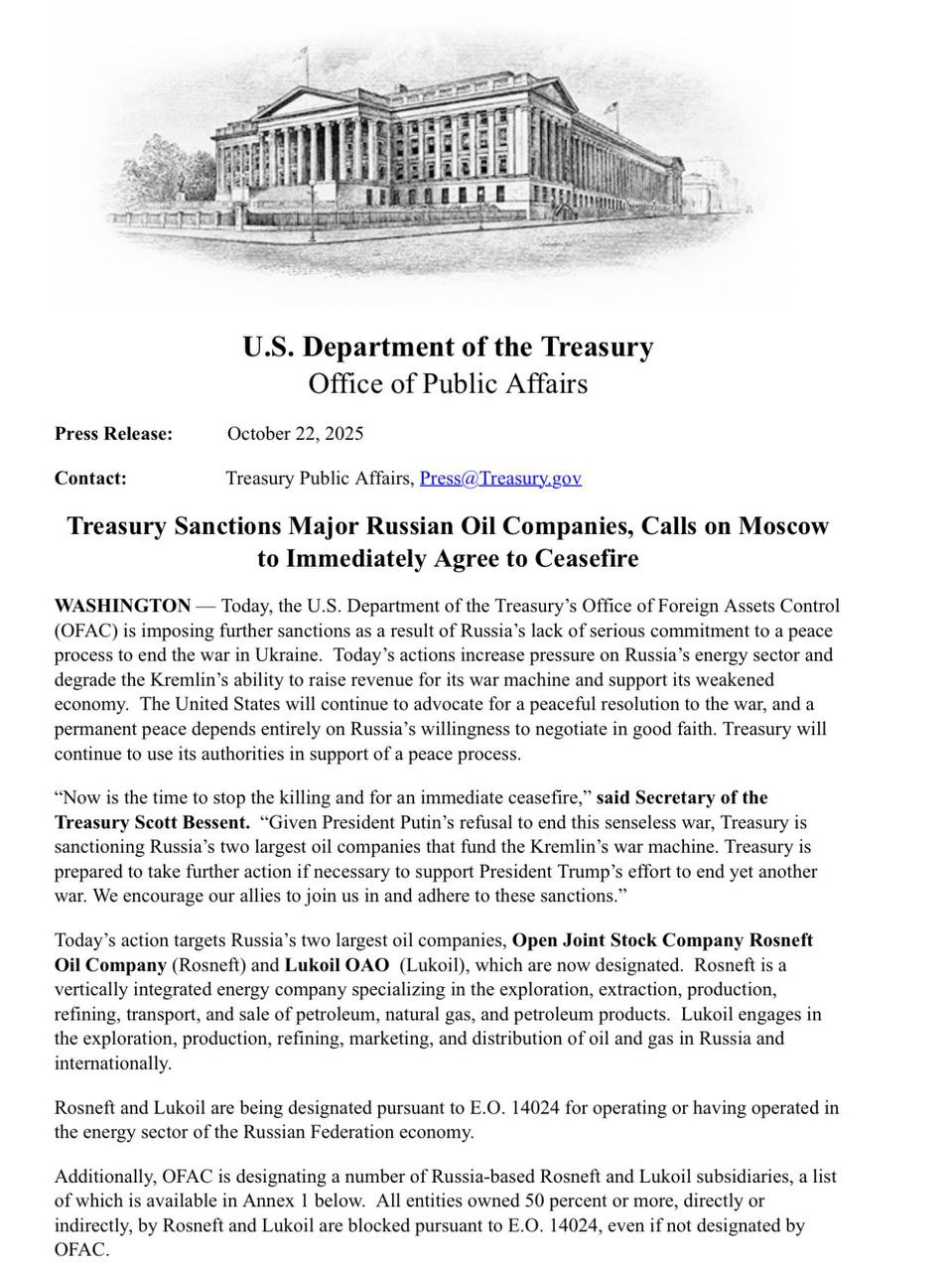 Все активы и имущественные интересы «Роснефти» и «Лукойла», находящиеся в США или под контролем американских лиц, блокируются.