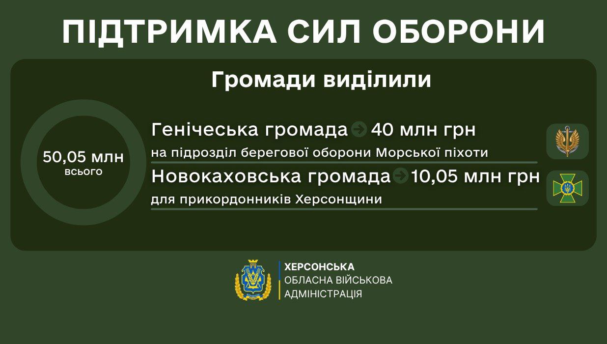 В рамках совместного проекта Херсонской ОВА и местных общин в течение недели перечислено более 50 млн грн за счет местных бюджетов области. Средства направлені на поддержку ВСУ.