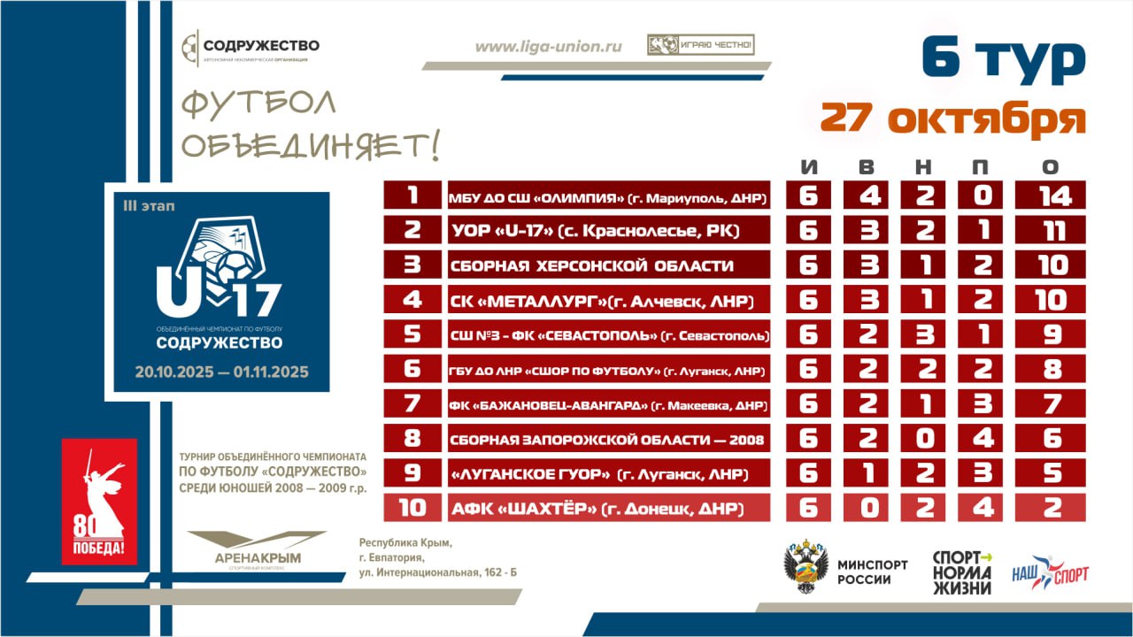 Турнирная таблица после 6 тура III этапа турнира Объединённого чемпионата по футболу «Содружество» среди юношей 2008-2009 годов рождения (U17)