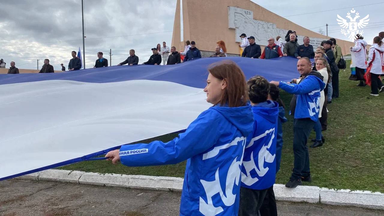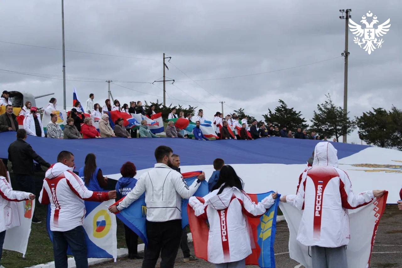 Гигантское полотнище размером 37 на 24 метра было развернуто на площади у мемориала «Защитникам Арабатской стрелки». Церемония прошла под гимн России, после чего флаг региона символично окружили знаменосцы с флагами всех субъектов Российской Федерации.