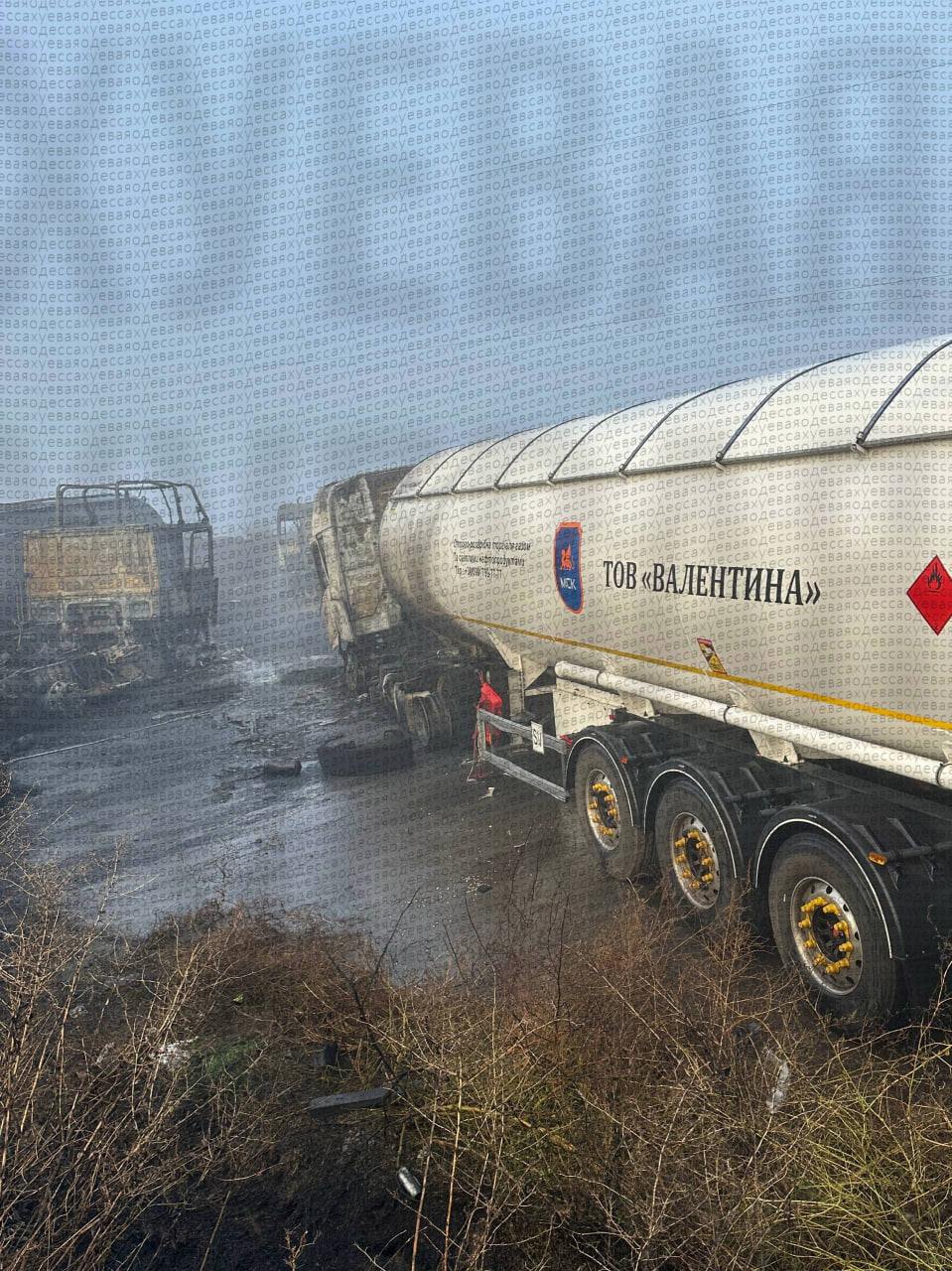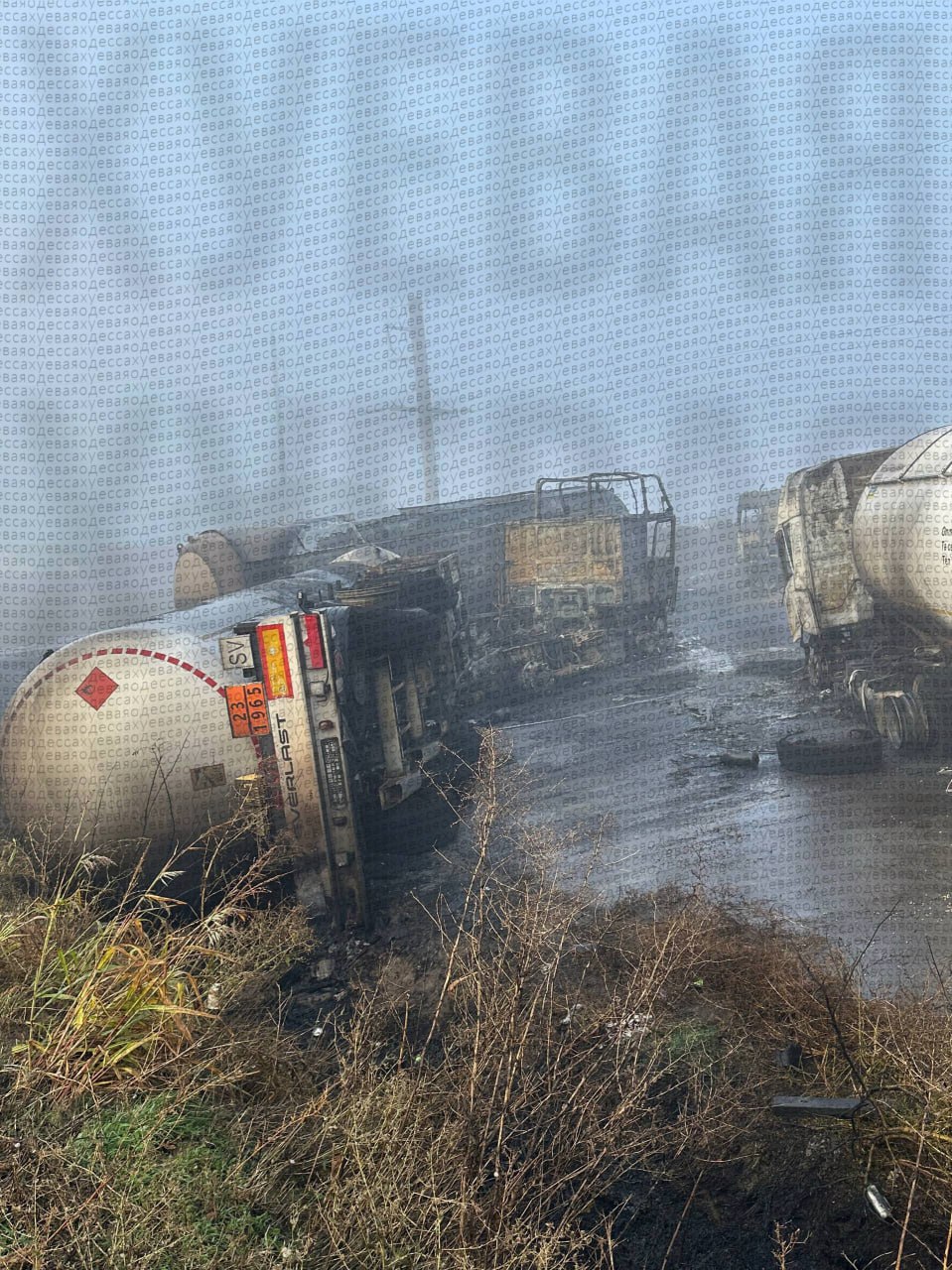 "Сгорели пять грузовиков, погибли два человека, четверо ранены, один из них госпитализирован с ожогами", сообщают местные Тг-каналы.