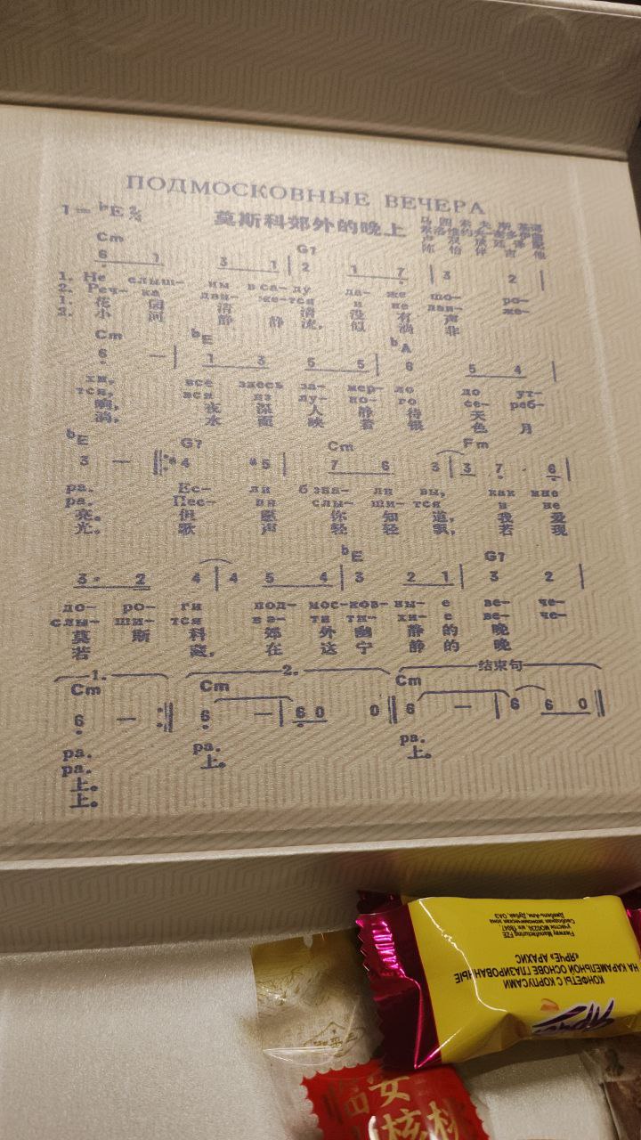 На внутренней стороне коробки оказалась изображена табулатура для знаменитой советской композиции «Подмосковные вечера». И не случайно: уже более 50 лет она является хитом в Китае. Автор перевода Сюэ Фань считал, что эта песня стала частью мыслей китайцев о молодости и их чувств.