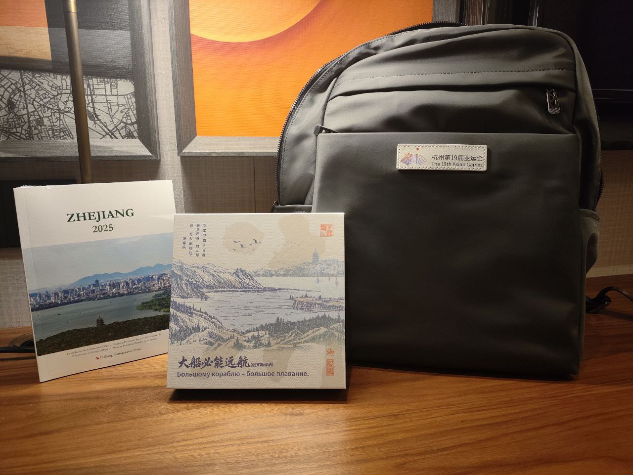 Всем известно, что народ Китая очень гостеприимный.В гостинице российских журналистов ждали несколько подарков: рюкзак, небольшая книжка о провинции Чжэцзян, где расположен город Ханчжоу, и очень красивая подарочная коробка с традиционными сладостями Китая.