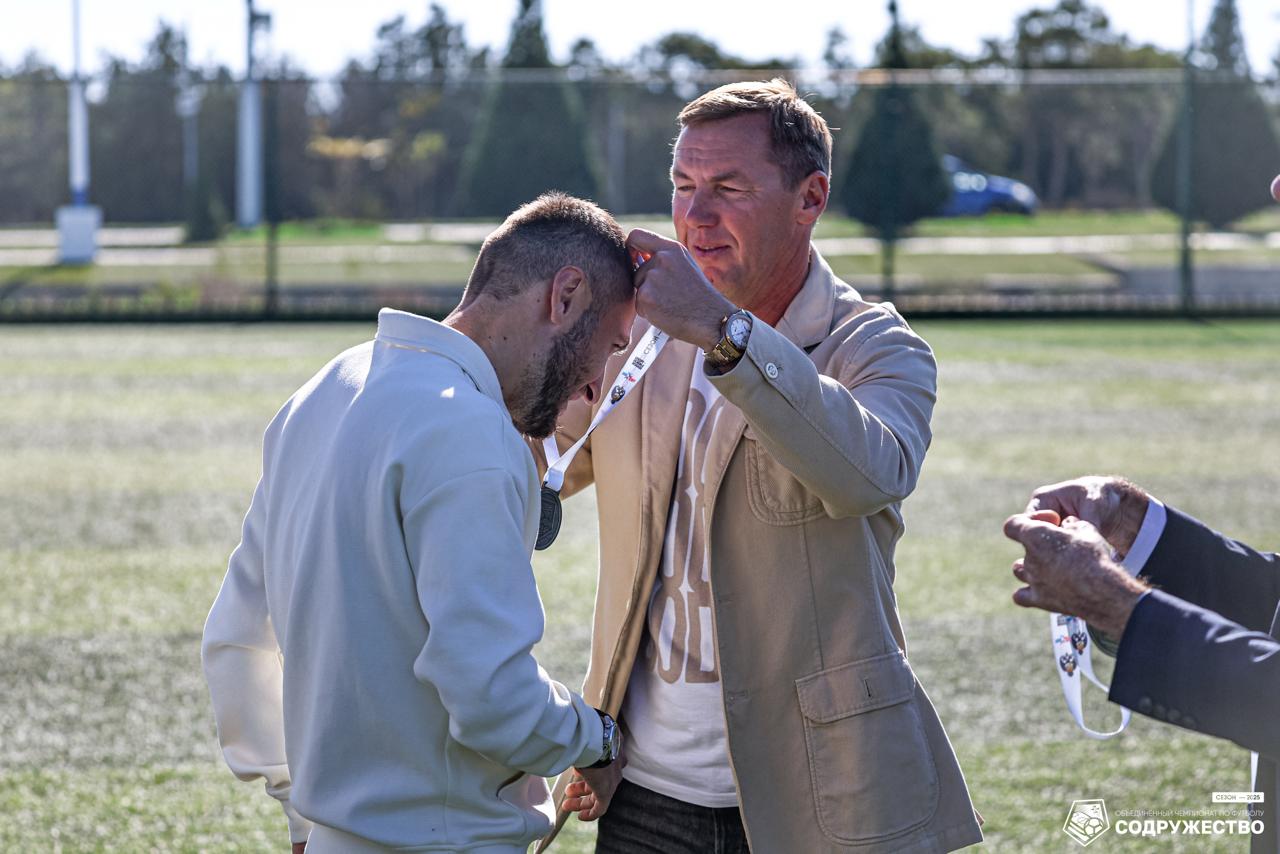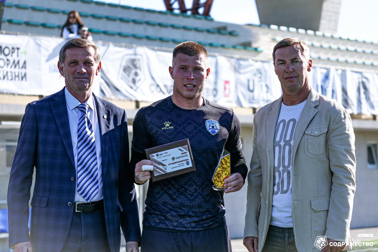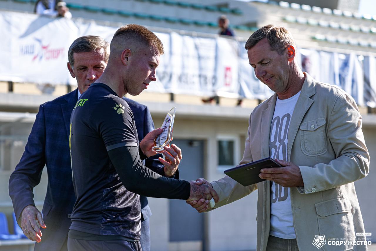 Председатель Правления Сергей Гапон вместе с руководителем спортивного комитета АНО "Содружество" вручили заслуженные награды команде и руководству футбольного клуба "Фрегат" (Херсонская область). Также индивидуальную награду получил Дмитрий Манонин - по результатам голосования футболист стал лучшим защитником чемпионата.