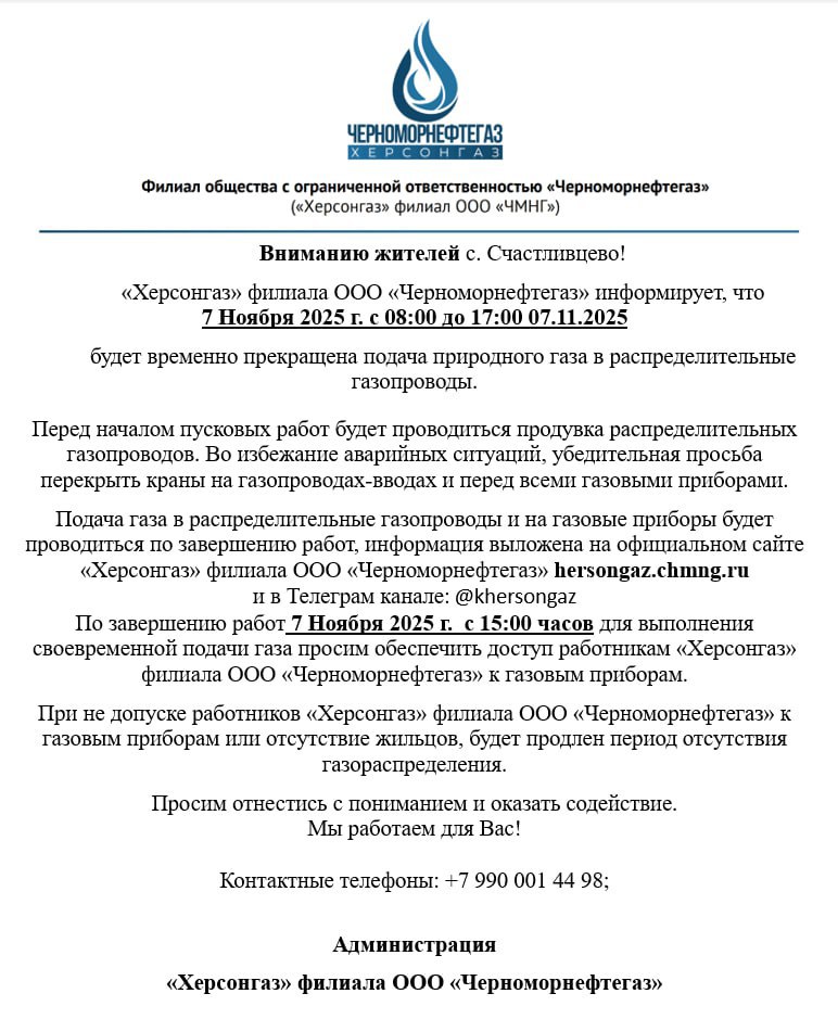 Филиал ООО «Черноморнефтегаз» («Херсонгаз») информирует, что 7 ноября 2025 года с 08:00 до 17:00 будет временно прекращена подача природного газа в распределительные газопроводы.