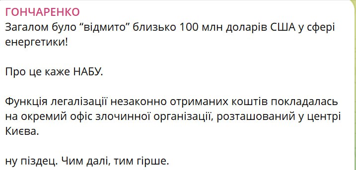 НАБУ заявляет, что через этот офис прошло около 100 млн долл. Там осуществлялся учет полученных средств, велась «черная бухгалтерия» и организовывались отмывания денег через сеть компаний-нерезидентов. Значительная часть операций, в том числе выдача наличных, проводилась за пределами Украины", — пишет украинский канал "Страна"*.