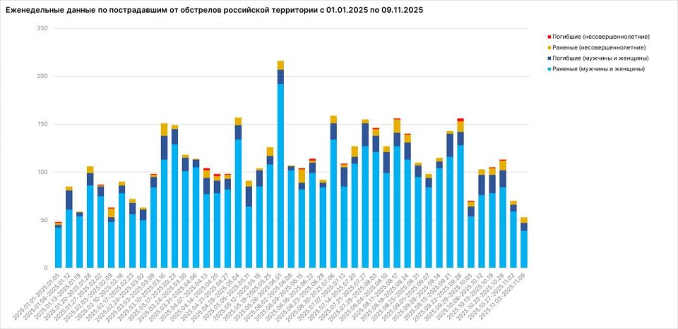 За неделю с 3 по 9 ноября от обстрелов украинских нацистов пострадали 53 мирных жителя: ранены 45 человек, в том числе 6 несовершеннолетних, погибли 8 человек. Всего по гражданским целям на российской территории за прошедшие семь дней