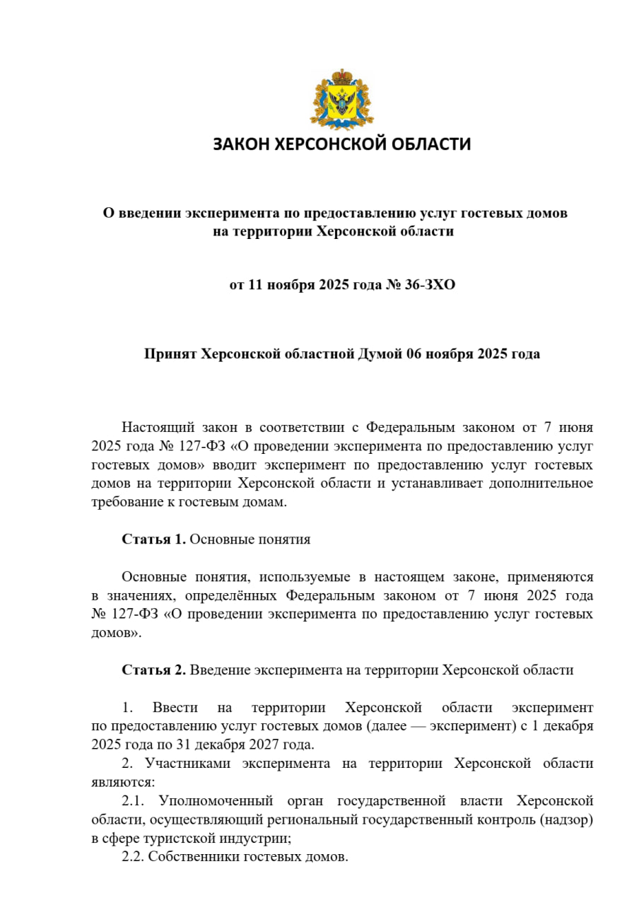 В Херсонской области приняли закон "О введении эксперимента по предоставлению услуг гостевых домов"