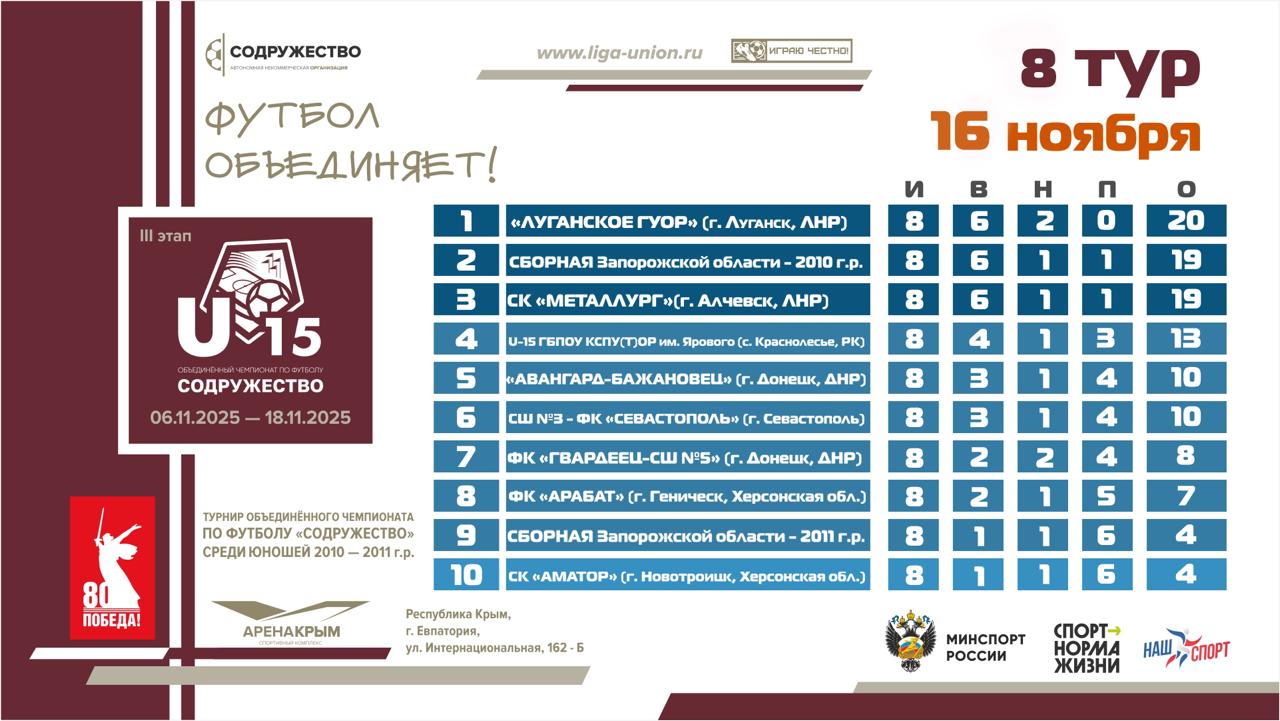 Турнирная таблица после 8 тура III этапа турнира Объединённого чемпионата по футболу «Содружество» среди юношей 2010-2011 годов рождения (U15)