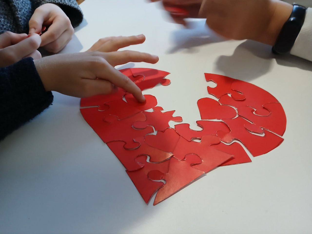 Символом дня доброты является сердце , дети из пазлов дружно сложили большое сердце дружбы.