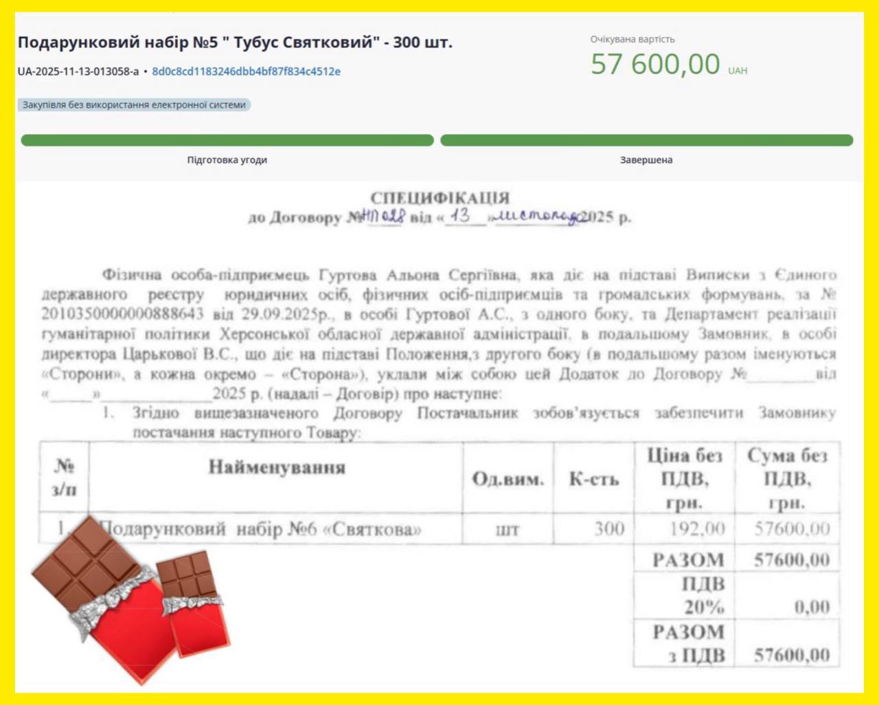 13 ноября департамент гуманитарной политики заключил договор с предпринимателем Алёной Гуртовой из Днепра на поставку 300 наборов сладостей.