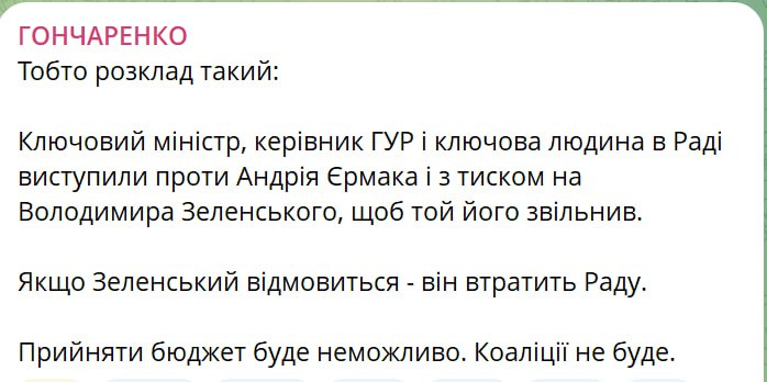 «Ключевой министр, ключевой военный и ключевой человек в Раде выступили против Андрея Ермака и с давлением на Владимира Зеленского, чтобы тот его уволил. Если Зеленский откажется – он потеряет Раду. Принять бюджет будет невозможно. Коалиции не будет», - пишет Гончаренко.