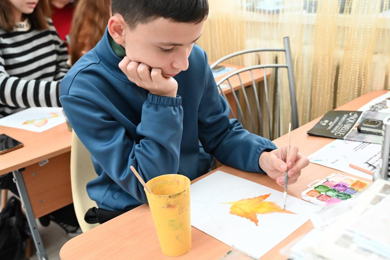 Педагог предложила учащимся изобразить опавший кленовый лист, демонстрируя на практике приемы работы с акварелью. Теоретическая часть занятия сопровождалась практическим показом, что позволило детям лучше понять специфику водорастворимых красок.