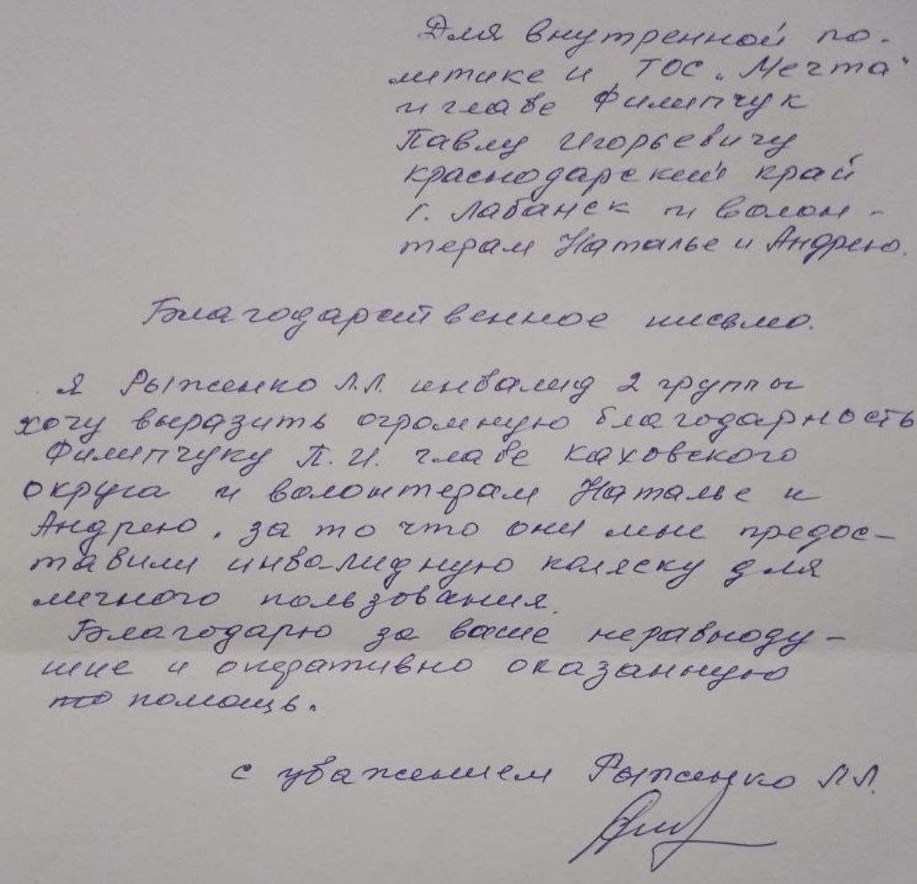 Леонид Рыженко, инвалид второй группы, выражает искреннюю благодарность главе округа Павлу Филипчуку и волонтерам Наталье и Андрею из ТОС «Мечта» за предоставление инвалидной коляски для личного пользования. Леонид благодарит за неравнодушие и оперативную помощь.