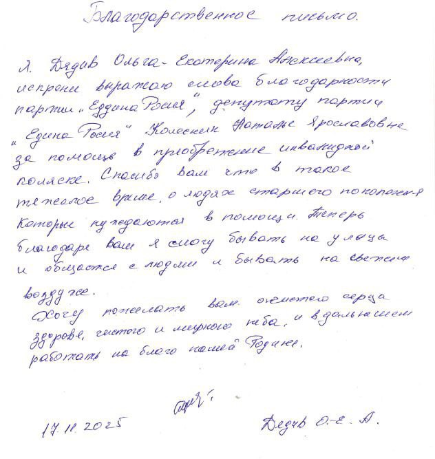 Теперь Ольга Алексеевна может гулять на улице. Ее семья от всей души благодарит партию и депутата Наталью Колесник за участие и доброту. Это событие стало для них очень значимым, они отмечают, что чувствуют себя нужными и искренне благодарны за заботу.