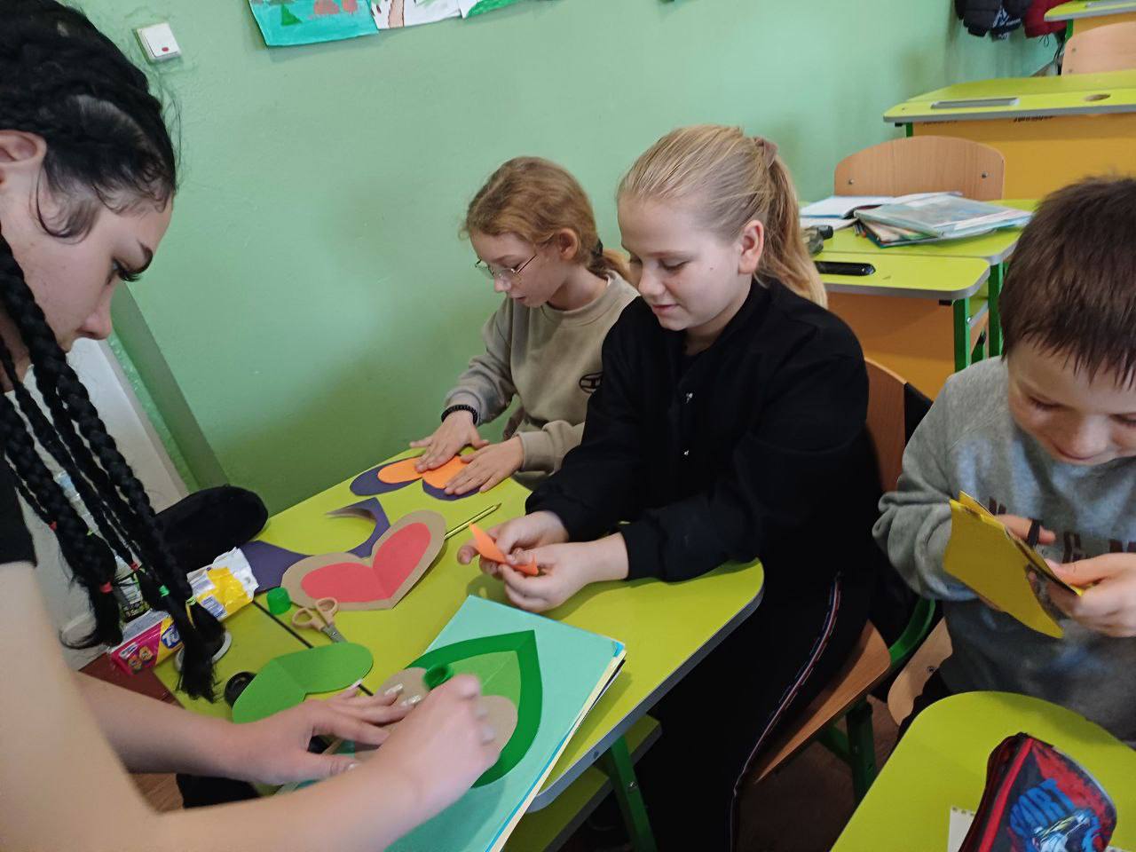 Девочки вместе с младшими школьниками рисовали, вырезали из бумаги и клеили украшения для открыток.