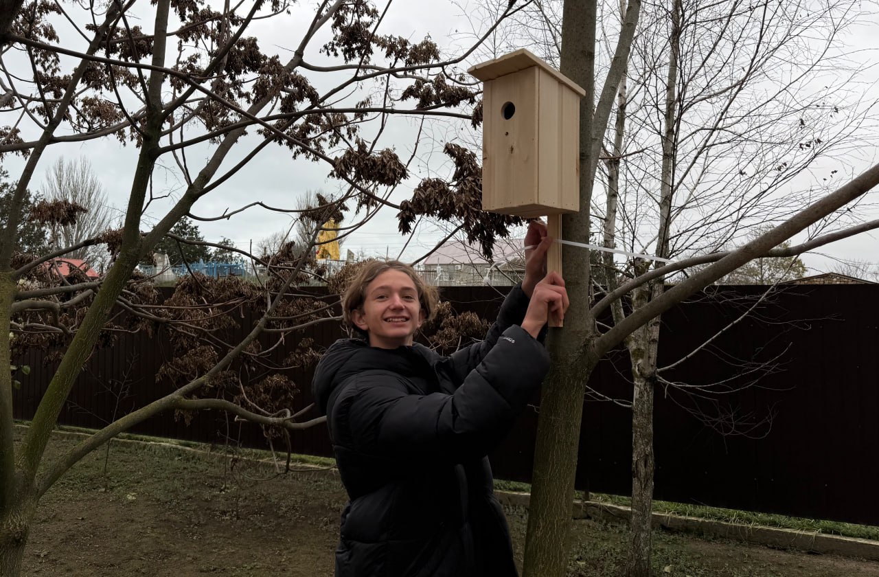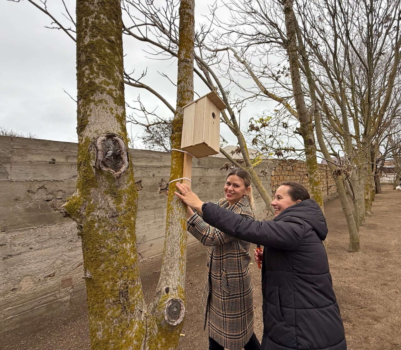 Ученики ГБОУ ХО «Счастливцевская школа Генического района» вместе с экологами и местной администрацией развесили домики для птиц на территории школы.