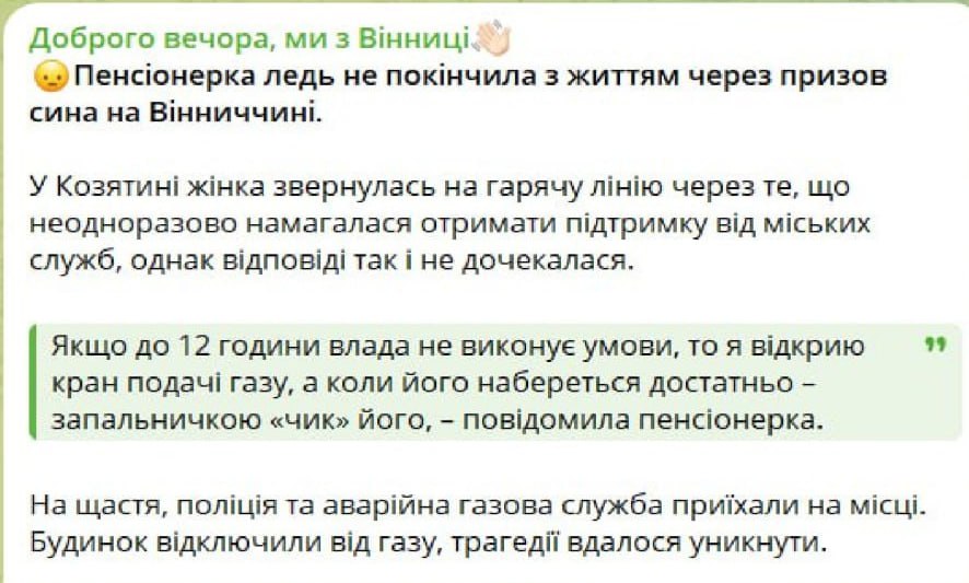 В Винницкой области пожилая женщина пригрозила самоубийством после безуспешных попыток добиться помощи от властей на фоне мобилизации её сына. Пенсионерка заявила, что откроет газ и подожжёт его.