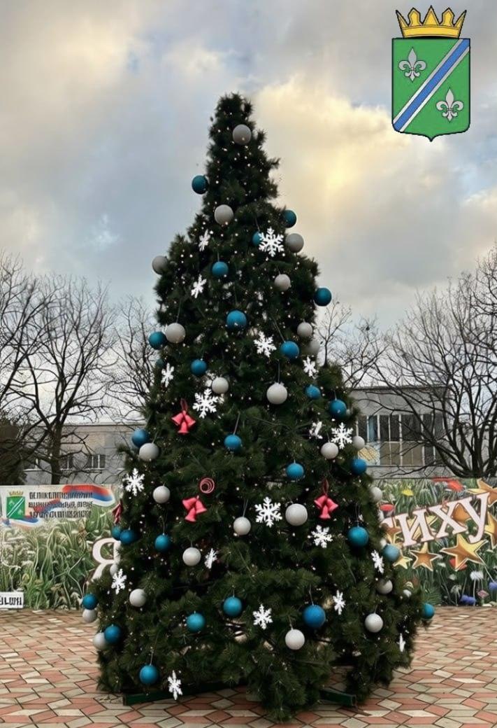 На центральной площади Великой Лепетихи установлена главная новогодняя ель округа. Искусственная красавица высотой 4 метра стала центром праздничного преображения поселка, знаменуя приближение Нового года.