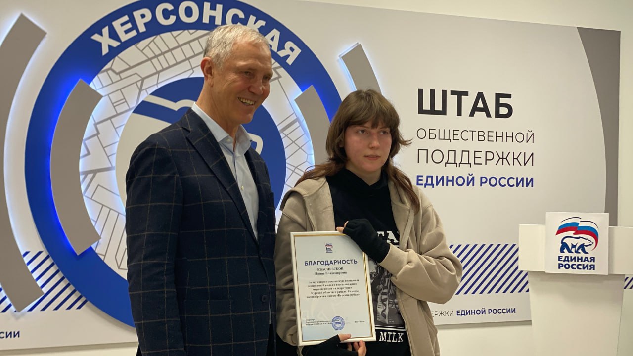 Губернатор также вручил благодарности студентам Генического техникума сферы обслуживания, принимавшим участие в одной из смен лагеря Единой России Курский рубеж. Его участники восстанавливают разрушенные киевскими боевиками во время вторжения в приграничные регионы дома и социальные объекты. Херсонские волонтеры Единой России оперативно включились в работу: производили замену кровли, вывозили строительный мусор, участвовали в поддержке работы самого лагеря.