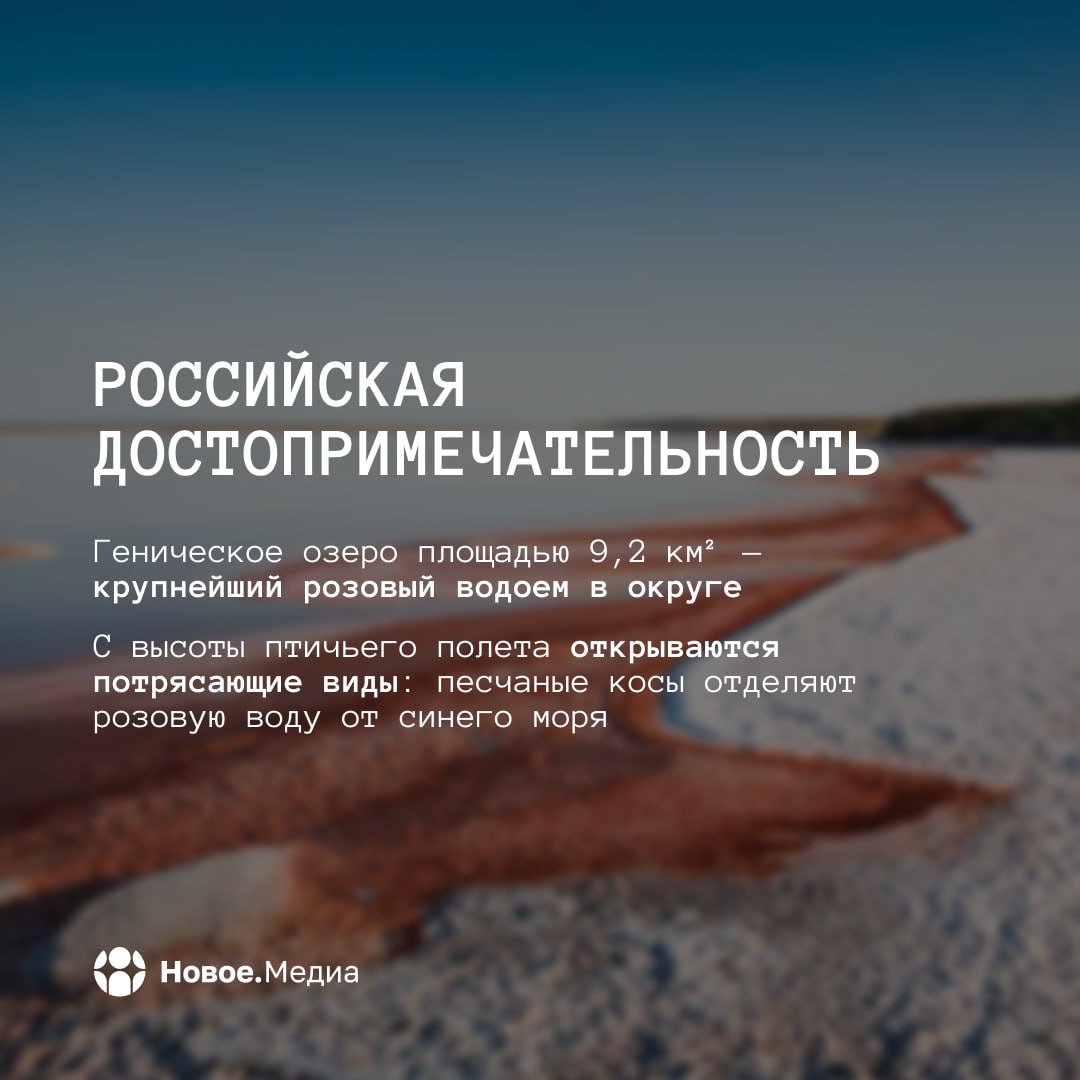 Всего в нескольких километрах от Геническа находятся удивительные розовый залив Сиваш и озера Геническое и Лемурийское. Их вода по концентрации соли почти не уступает Мертвому морю, а невероятный розовый цвет создают уникальные водоросли Дуналиелла.