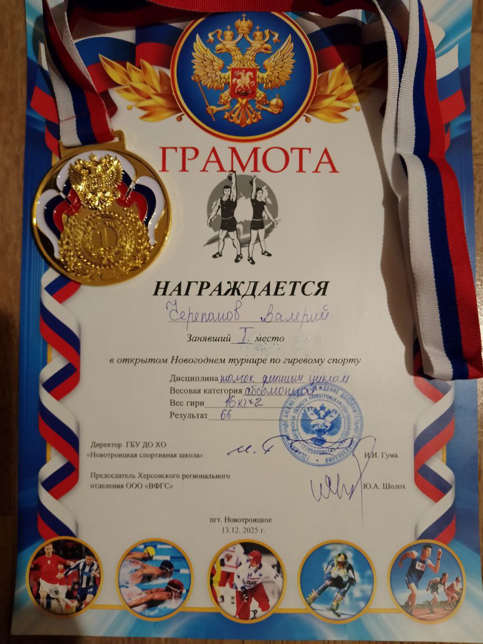 Наши ветераны, на которых можно и нужно ровняться, также приняли участие в первенстве и завоевали золото: Валерий Черепанов (61 год) выполнил 66 подъёмов с гирями по 216 кг за 10 минут, а Николай Семенов (72 года) — 118 подъёмов с гирями по 212 кг.