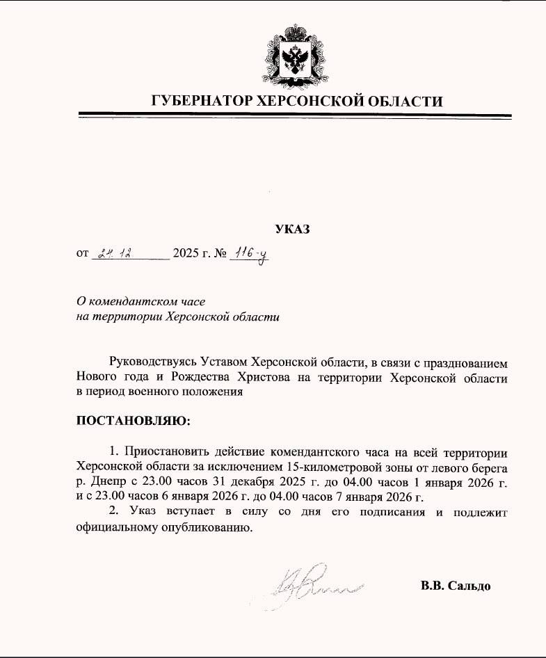 В связи с празднованием Нового Года и Рождества приостановил действие комендантского часа в ночь с 31 декабря 2025 года на 1 января 2026 года и с 6 января на 7 января на территории Херсонской области за исключением 15-километровой зоны от р. Днепр