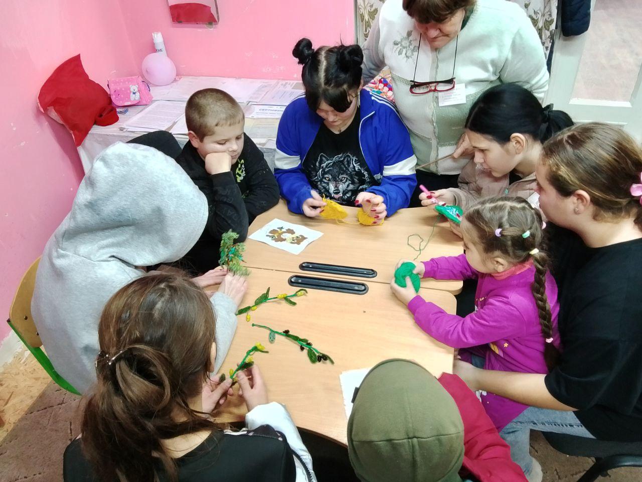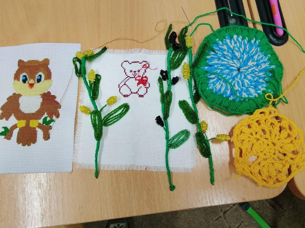 На каждом занятии девочки и мальчики осваивают различные виды креативного рукоделия. В тот раз руководитель показывала правильные способы в технике счетного крестика, вязания крючком и плетения бисером.