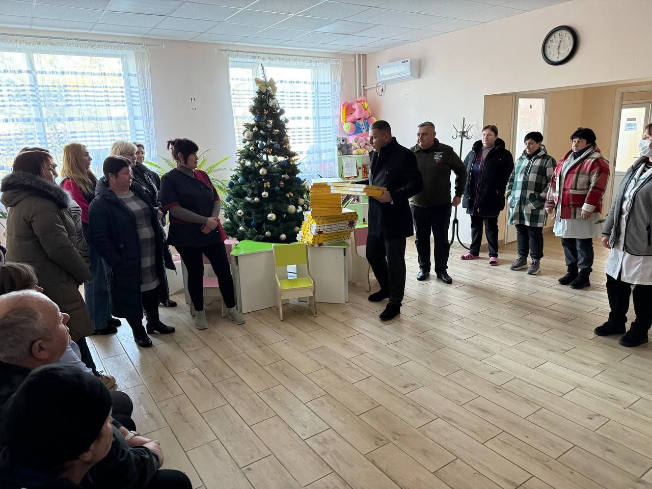 Врачи, медсестры, санитарки и другие сотрудники, нашедшие несколько минут в своем плотном рабочем графике, собрались в холле и получили небольшие новогодние сувениры, а также сладости к праздничному столу.