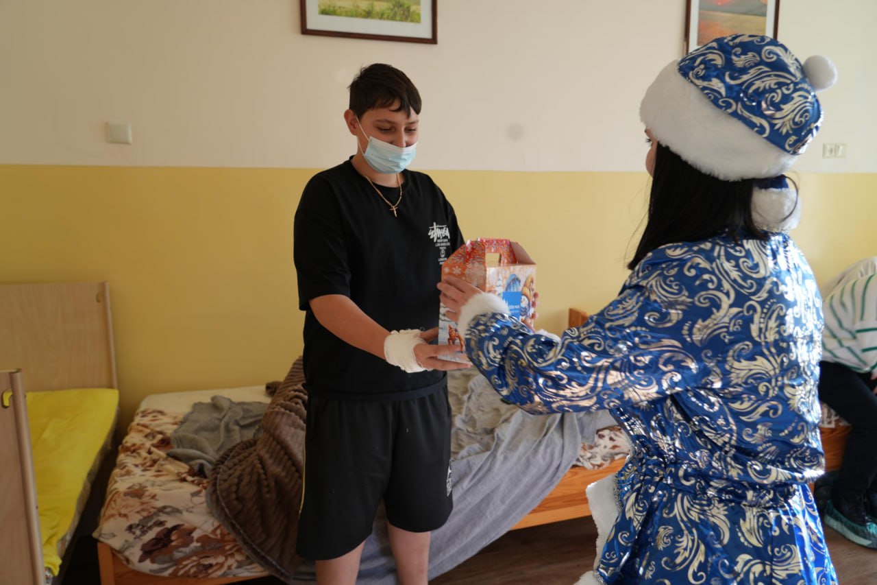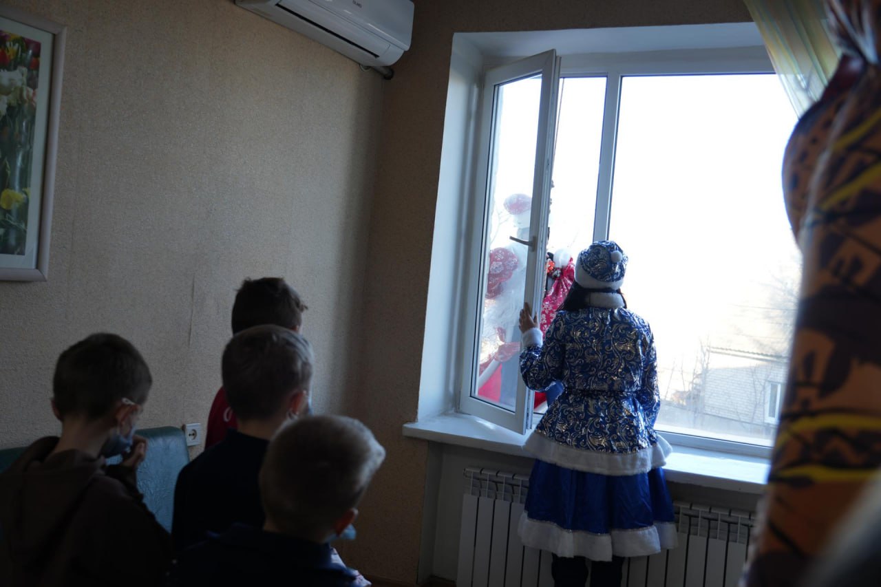К юным пациентам на праздник пришли гости — Снегурочка вместе со своими друзьями-динозаврами. Они развлекали детей в ожидании главного виновника торжества — Деда Мороза. Волшебник не заставил себя долго ждать и спустился с крыши с мешком подарков наперевес, чтобы поприветствовать ребят.