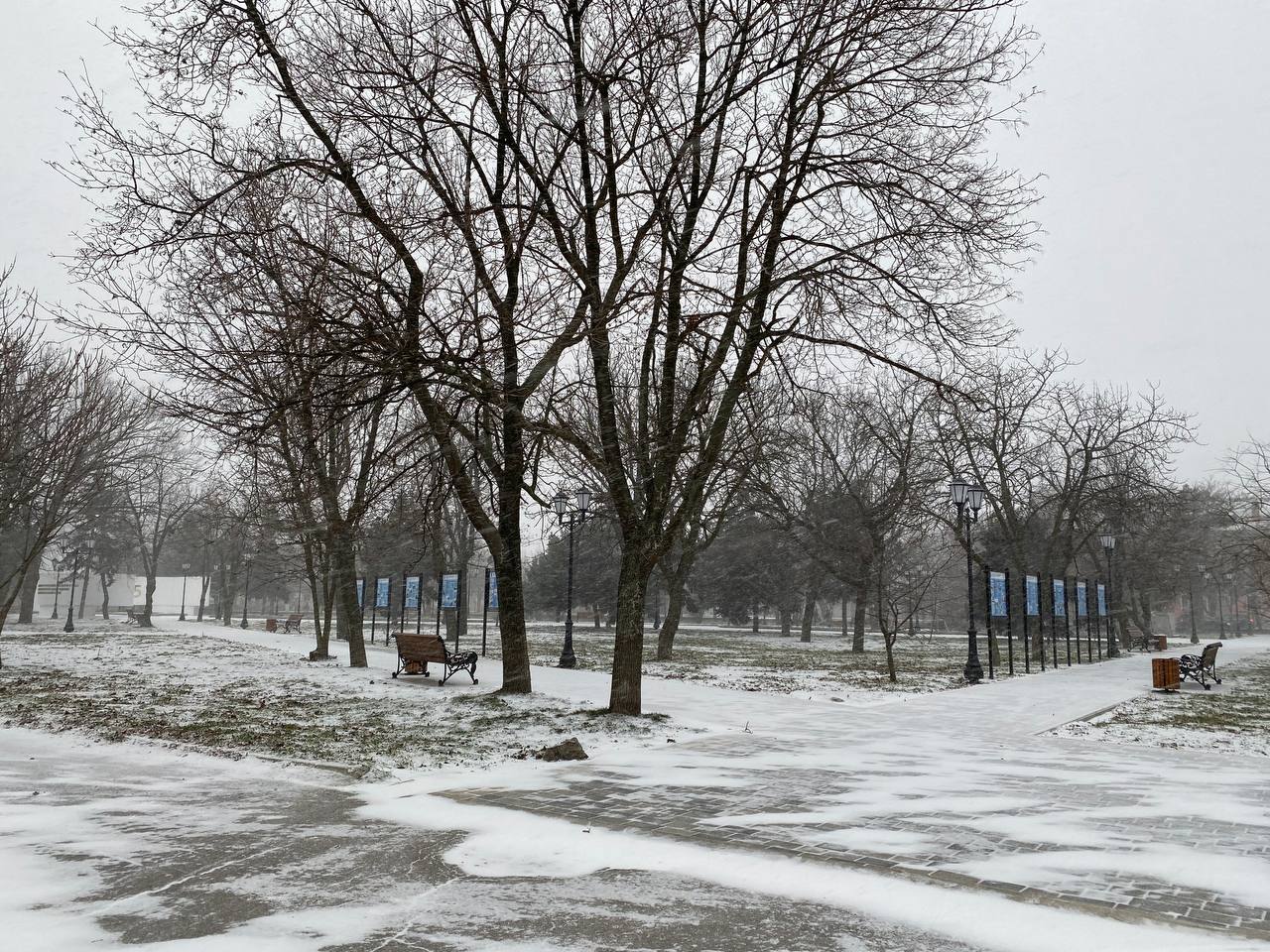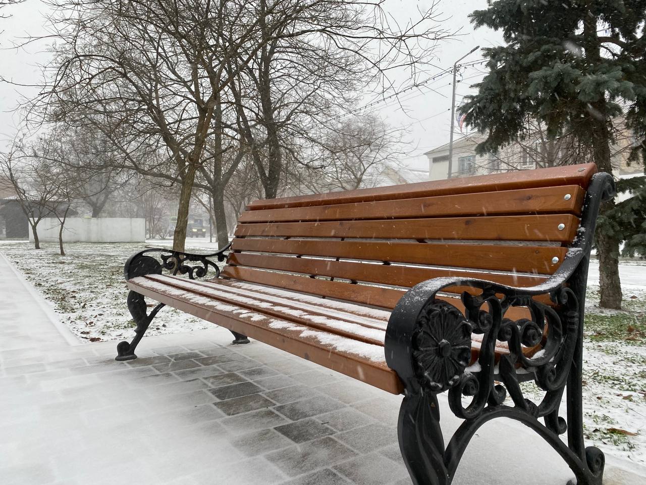 Геническ #сейчас. Посмотрите, как красив наш город, укутанный первым снегом! На фото главная городская ёлка и сквер «Скорбящая мать», реконструированный в этом году по проекту «Единой России» #ГородскаяСреда