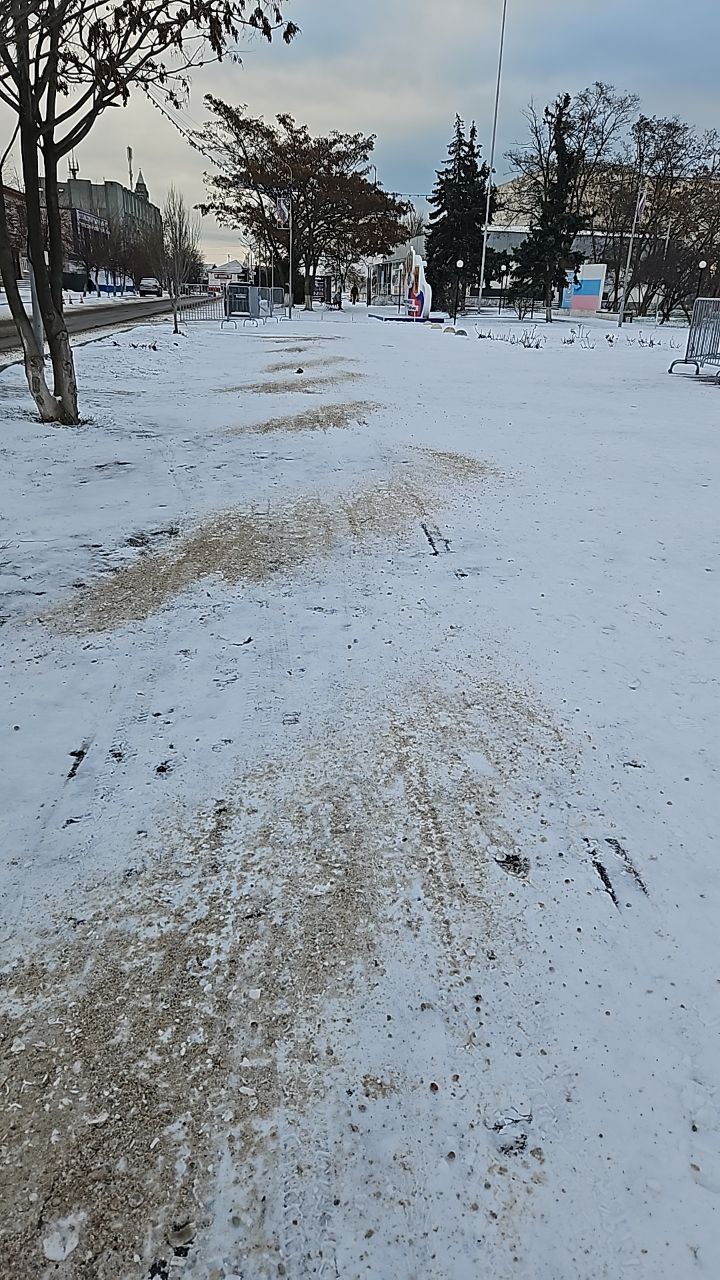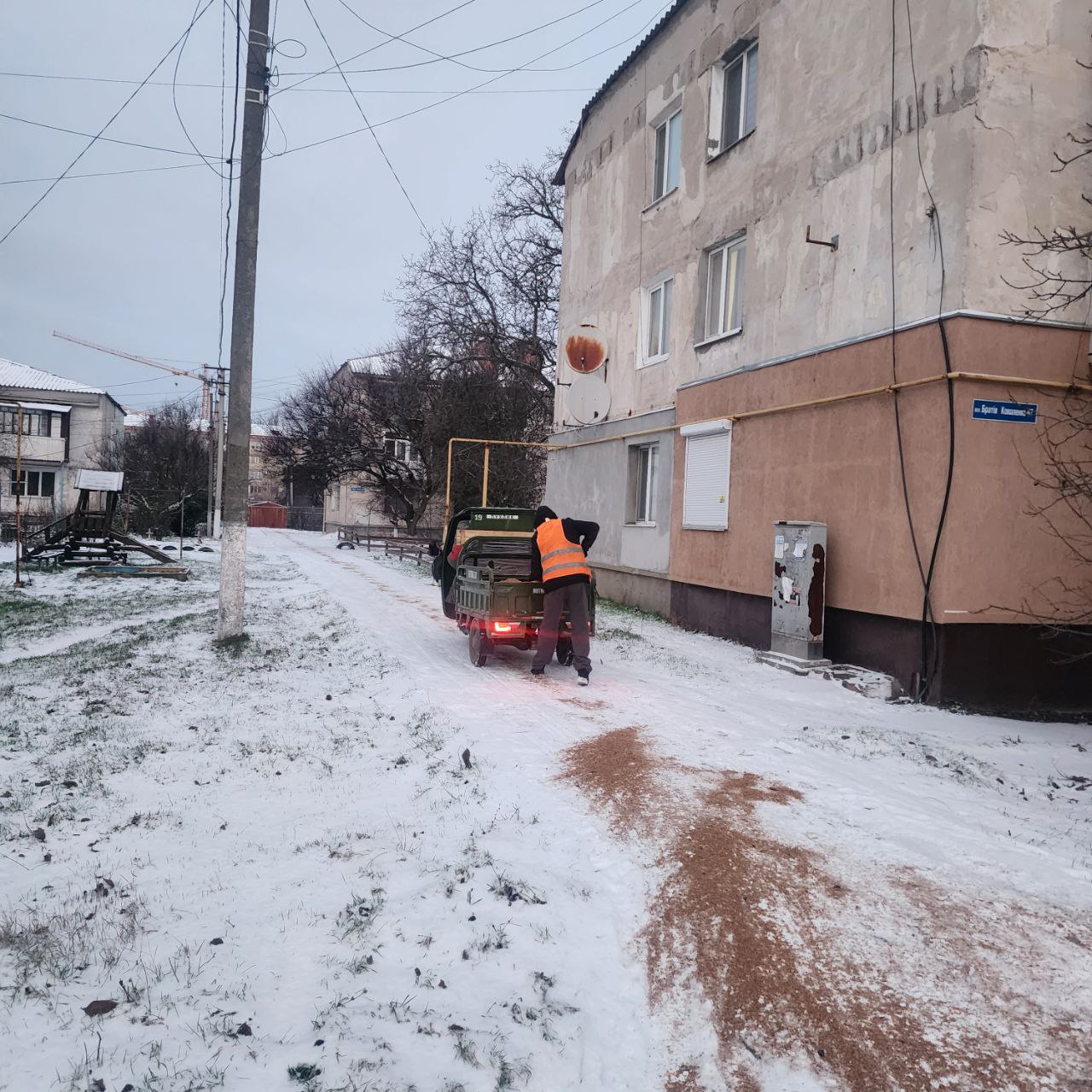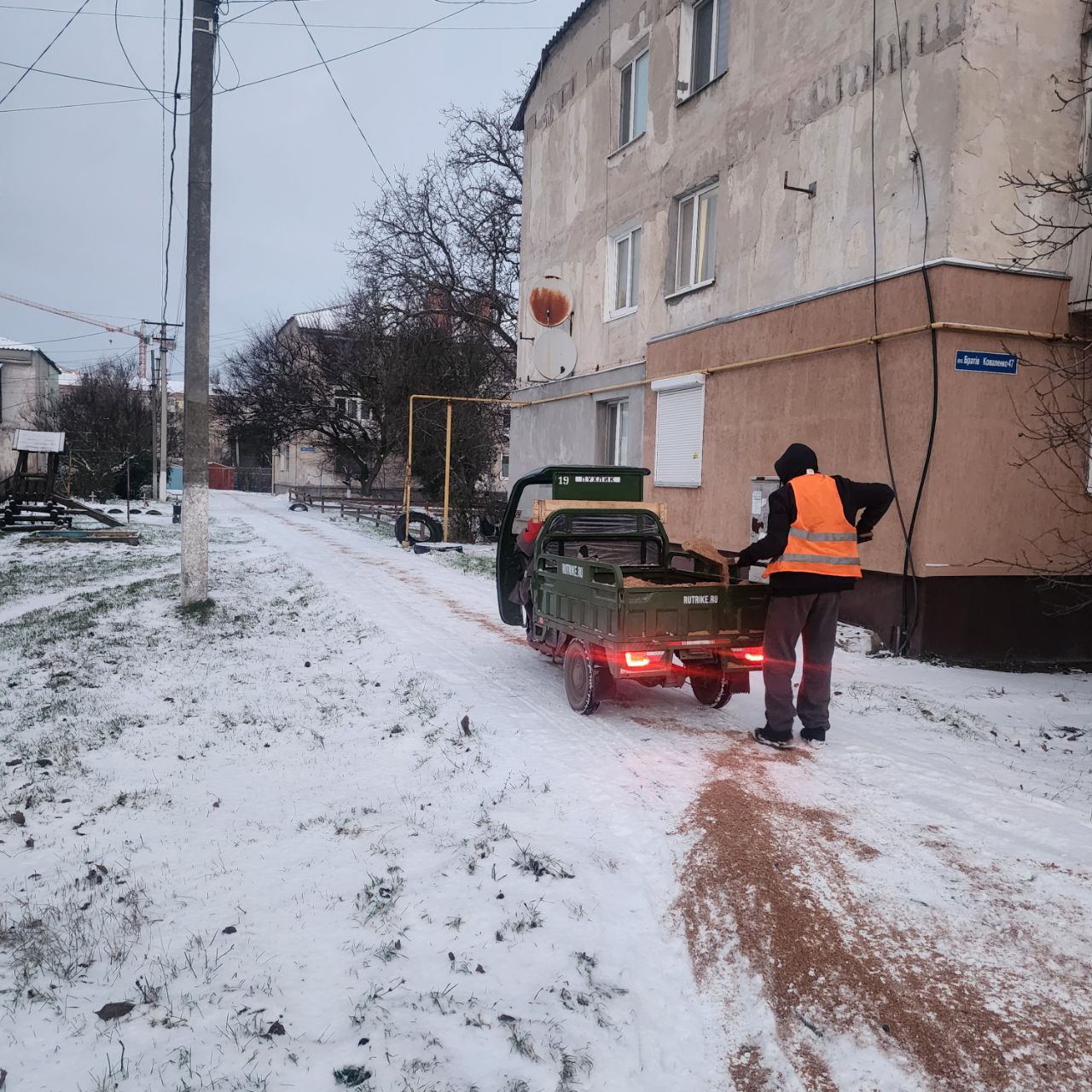 Работники МКУ «Азовкоммунсервис» и «Горжилстрой» с раннего утра занимаются посыпкой городских дорог, тротуаров, перекрестков, пешеходных дорожек, парков и скверов.