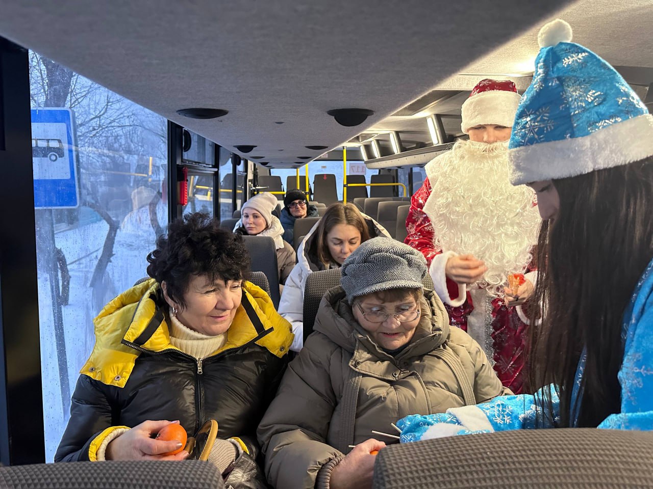 Акция «Единой России» и «Херсонавтотранссервиса» регионального Минтранса «Дорога в Новый год» прошла в междугородних автобусах. Волонтеры «Молодой Гвардии Единой России», студенты Генических техникума сферы обслуживания и строительного колледжа в костюмах Деда Мороза и Снегурочки поздравили пассажиров автобусов Геническ – Стрелковое и других маршрутов.