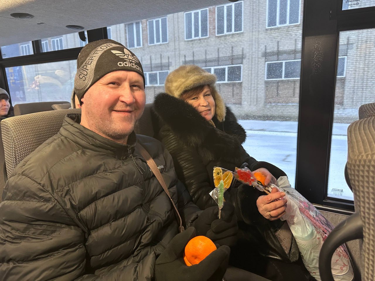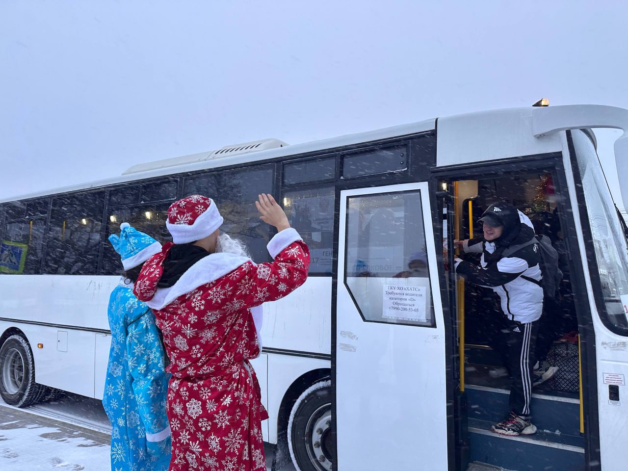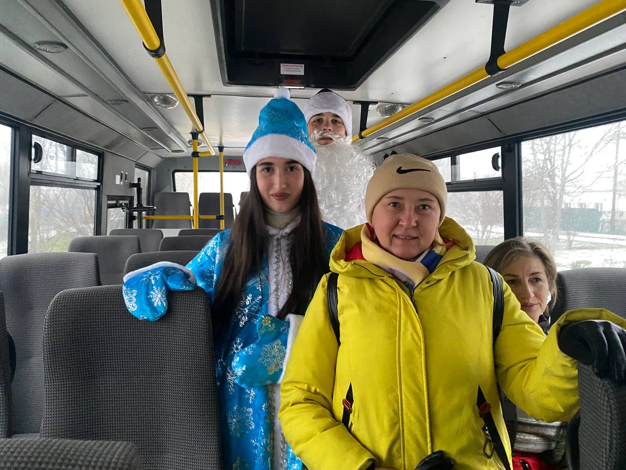 Следующая остановка «Новый год»: Дед Мороз и Снегурочка поздравили пассажиров автобусов, отправляющихся из Геническа в другие населенные пункты округа
