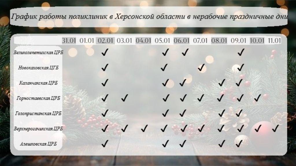 В праздничные дни поликлиники медицинских организаций Херсонской области будут работать согласно графику. Подробный график работы каждой поликлиники представлен в карточках вверху.