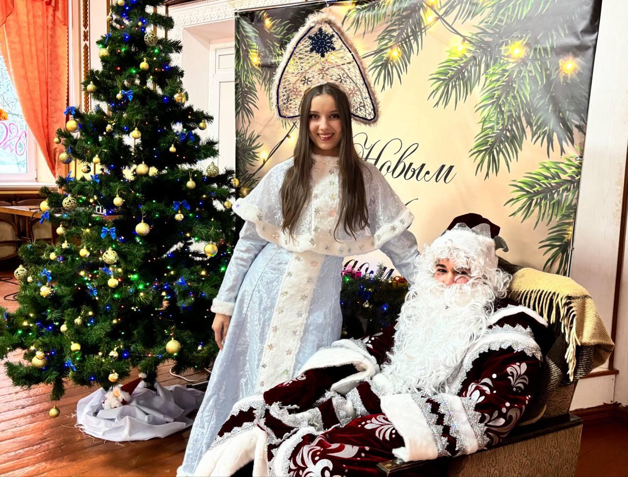 С наступающим Новым годом гостей поздравили Дед Мороз и Снегурочка и вручили юным жителям новогодние сладкие подарки от администрации округа.