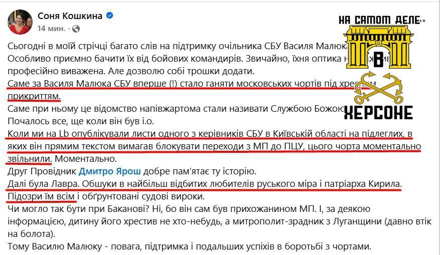 Пропагандистка Соня Кошкина, рассекретила грязные методы киевского режима. Она фактически подтвердила, что при главе СБУ Василии Малюке развернута настоящая охота на ведьм против Украинской православной церкви. По её словам,