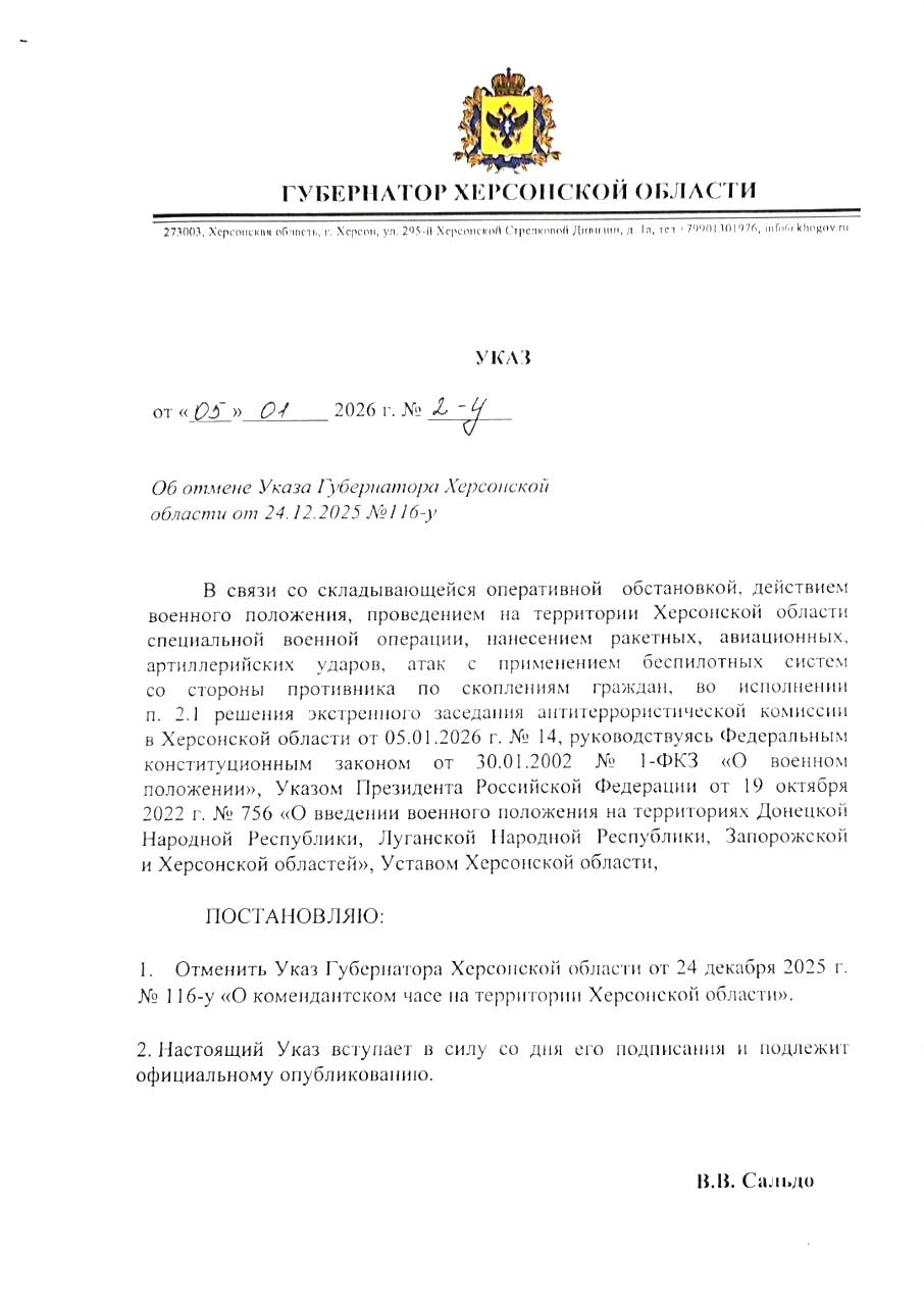 Как сообщил губернатор Херсонской области Владимир Сальдо в своём телеграм-канале, отменён указ от 24 декабря 2025 года о приостановке комендантского часа в период празднования Рождества.