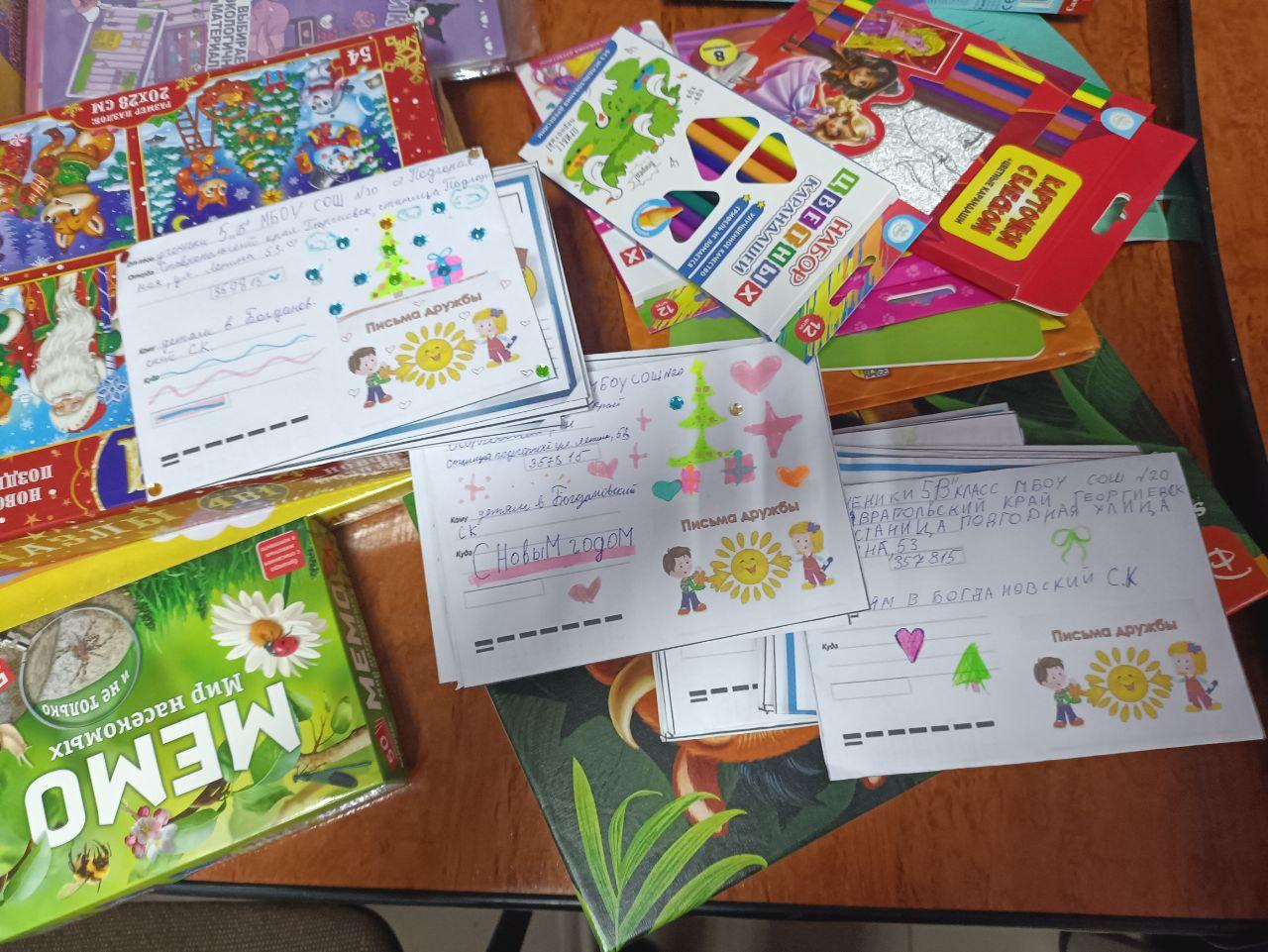 Кроме того, волонтеры привезли письма от детей с поздравлениями к праздникам. Ребята из Богдановки также написали ответные письма своим сверстникам из Ставропольского края.