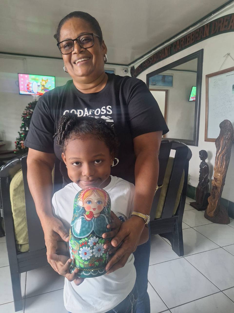 Благодарю ее превосходительство госпожу министра-советника Президента Республики по вопросам внешней политики и международных отношений, Чрезвычайного и Полномочного Посла Альбу Асусену Торрес Мехия, которая обещала передать в Никарагуа подарок из России и выполнила его в канун Новогодних праздников. Малышка получила специально от меня русскую матрешку и платок.