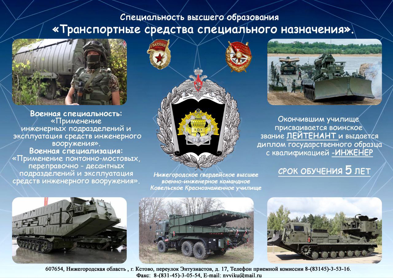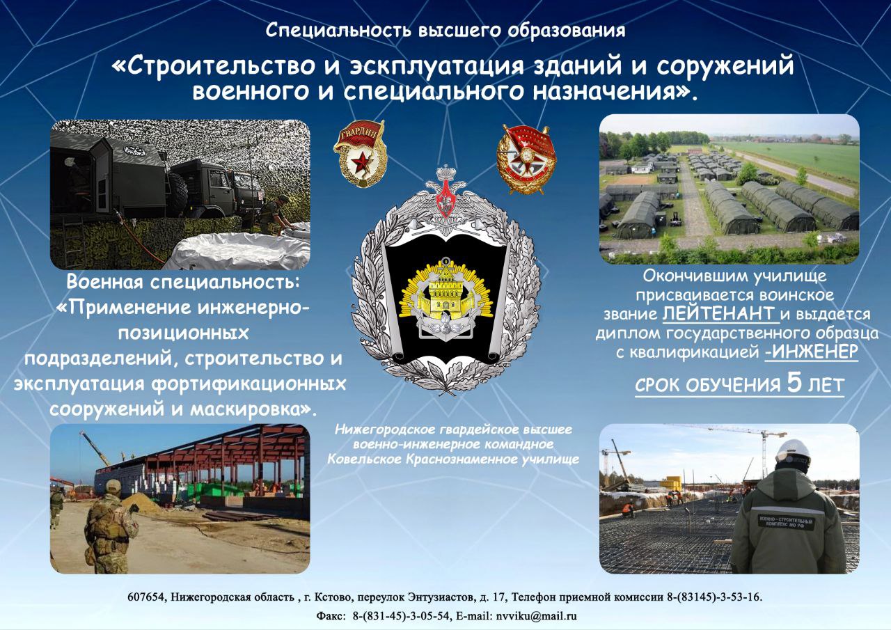 Нижегородское гвардейское высшее военно-инженерное командное Ковельское Краснознаменное училище готовит дипломированных специалистов высшего образования с полной военно-специальной подготовкой по четырем военным специальностям и шести военным специализациям.