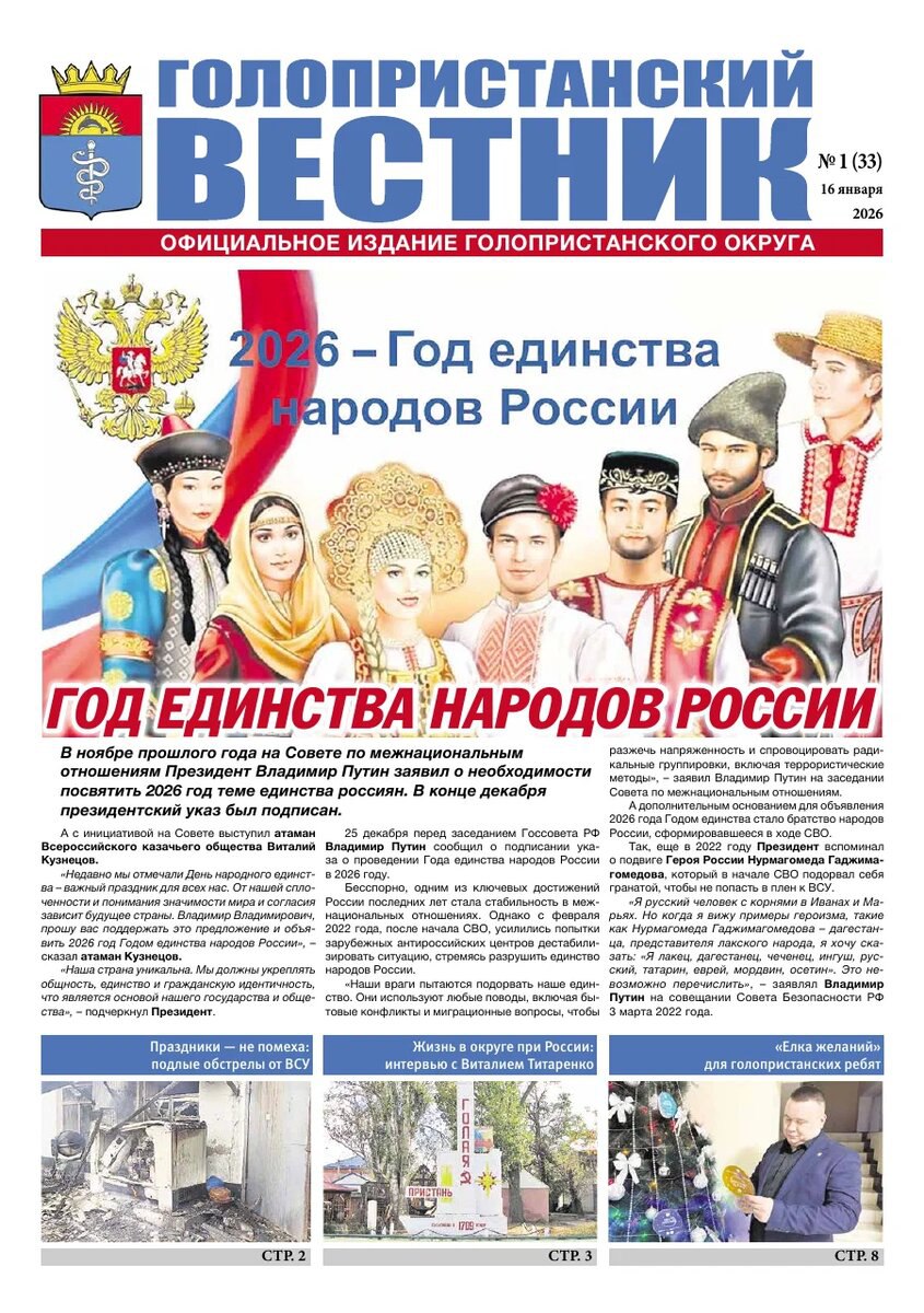2026 год объявлен Годом единства народов России — указ президента Владимира Путина, направленный на укрепление межнационального согласия, стр. 1.