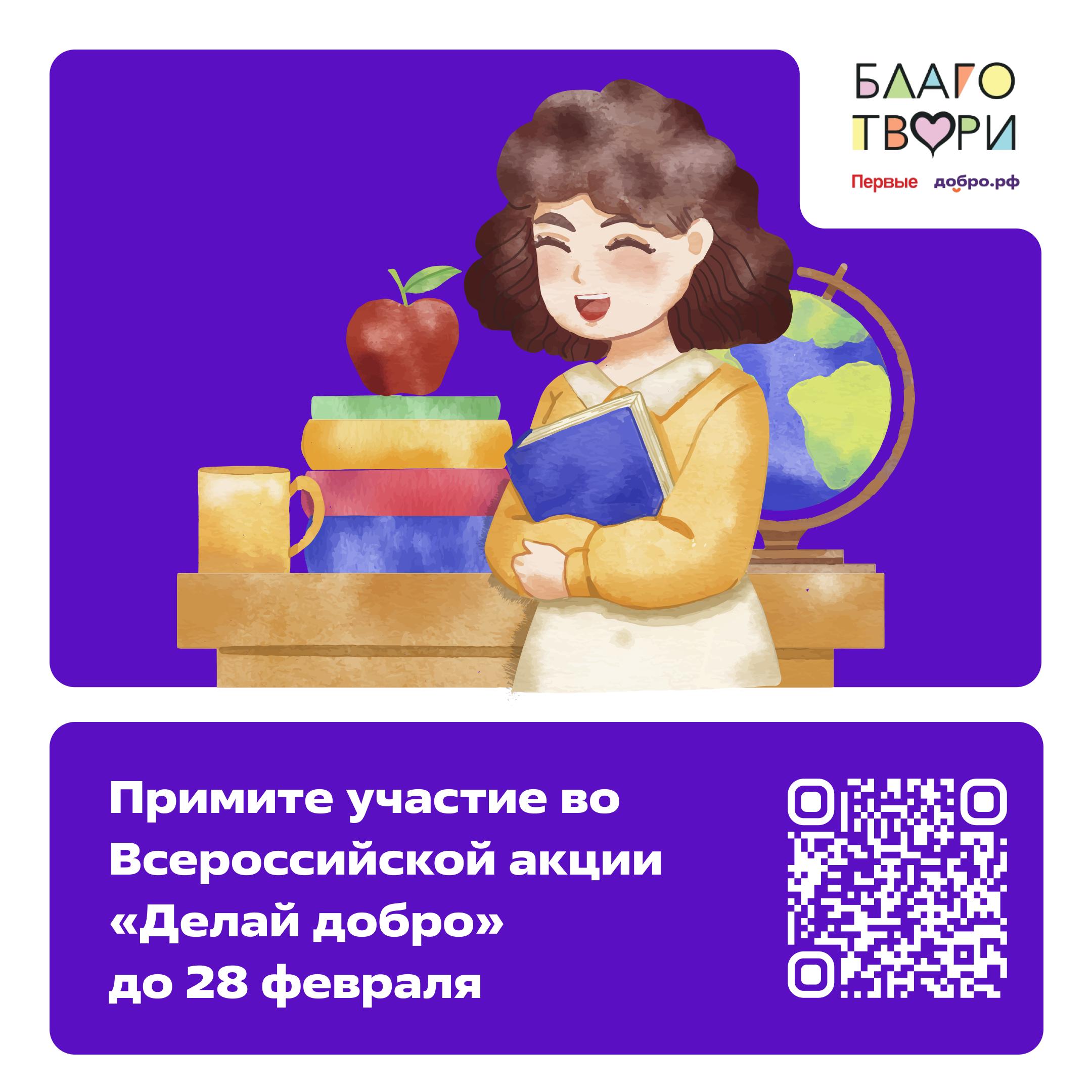 Классные руководители и представители школ, приглашаем ваших учеников принять участие в акции «Делай Добро», которая проходит в Календаре Первых совместно с платформой Добро.рф и Движением Первых до конца февраля