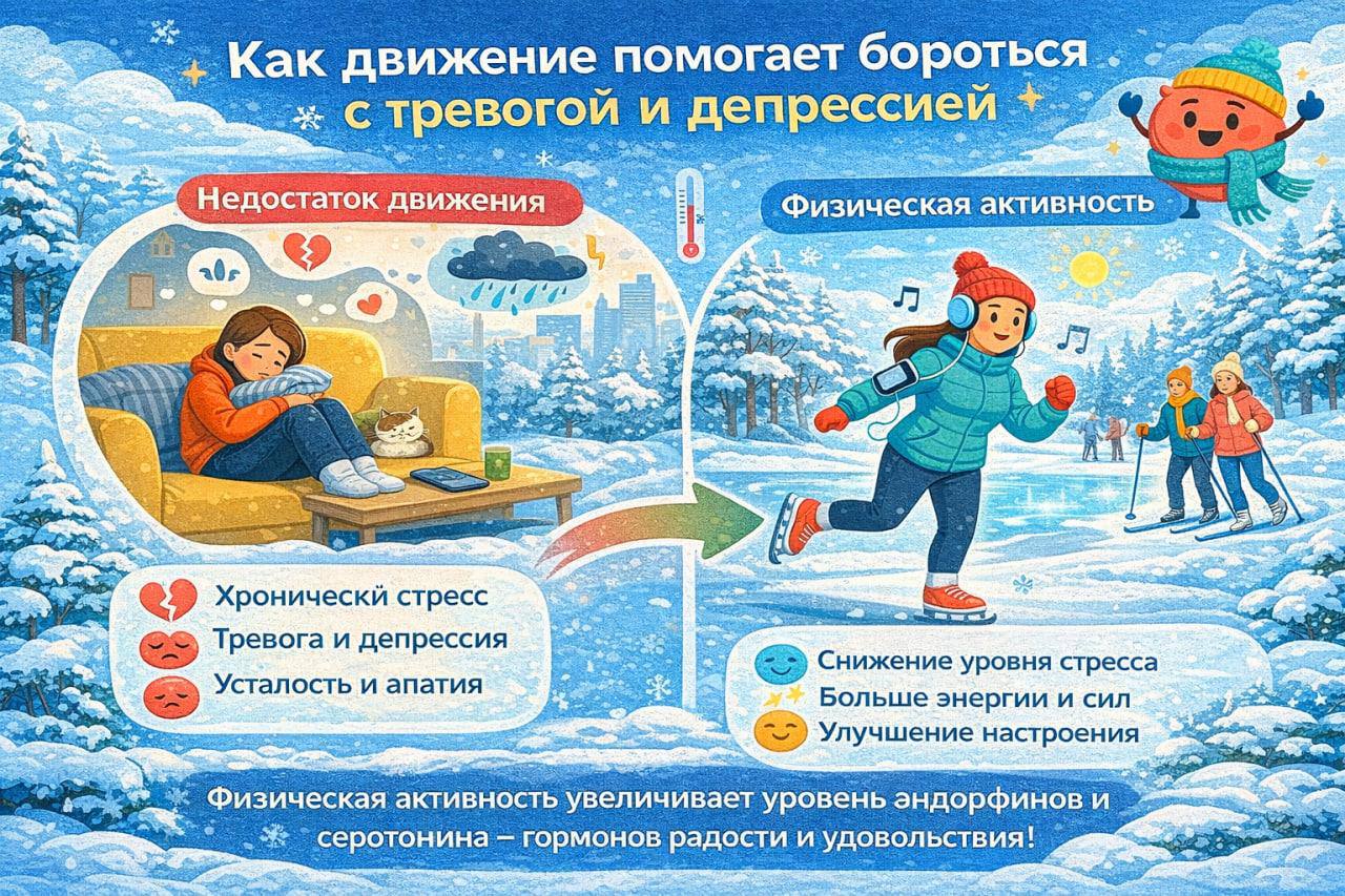 Регулярная физическая активность является эффективным немедикаментозным способом поддержки психического здоровья. Научные исследования подтверждают, что движение способствует снижению уровня тревоги и депрессивных состояний, улучшая общее эмоциональное самочувствие и качество жизни.