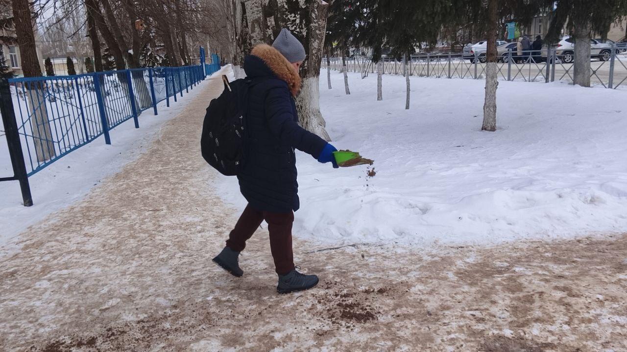Отметим, работы проводятся комплексно. Противогололедная смесь подвозится на место автомобильной техникой, и пока одни убирают снег, другие посыпают уже убранные пешеходные дорожки.