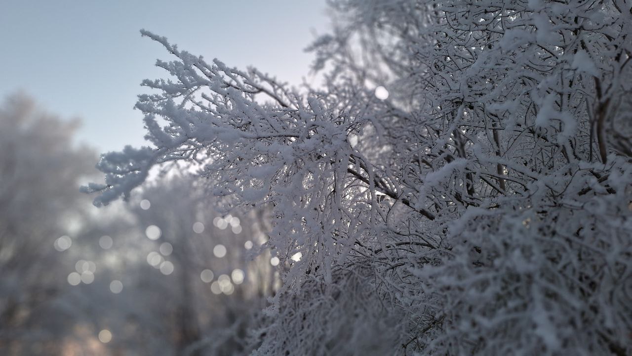 Иней - это сублимированный пар, который, оседая на ветвях, сразу превращается в лед, минуя фазу жидкости. По сути, это кристаллизованный туман. Такое явление возможно при низких температурах и высокой влажности воздуха.