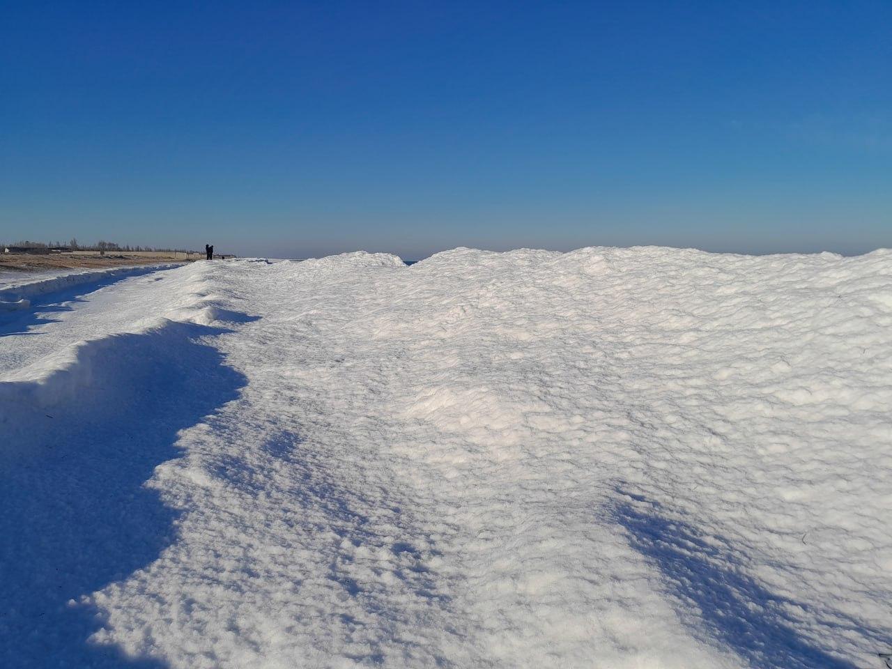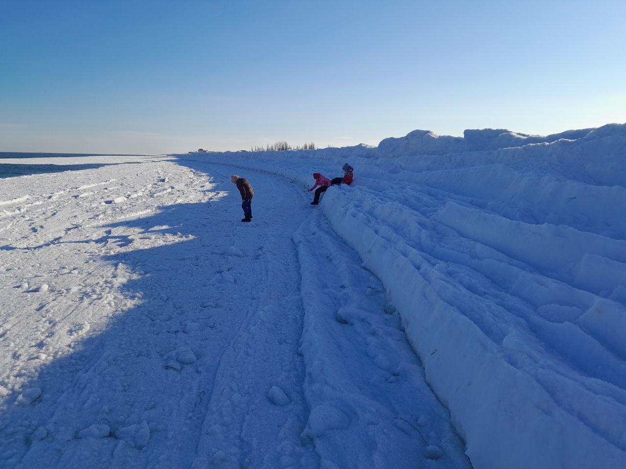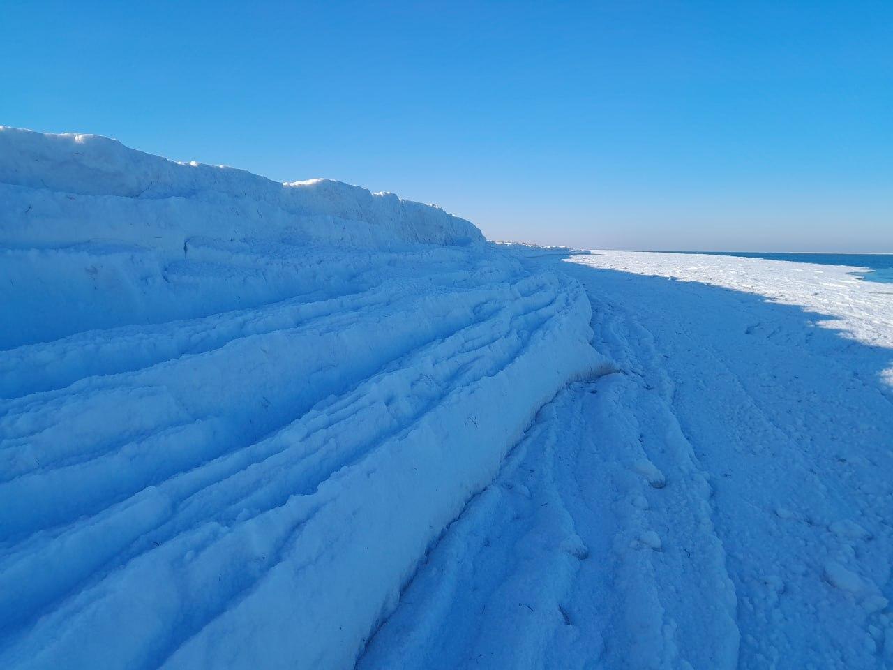 В отличие от покрытого сплошным льдом залива, местное море остаётся открытым. Сильный ветер, однако, пригнал к берегу массивные льдины, образовав причудливый рельеф из ледяных нагромождений.