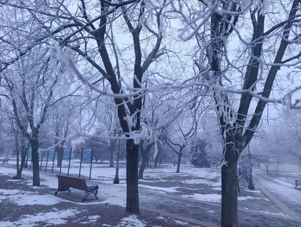 Сегодня Геническ и Арабатскую Стрелку окутал густой молочный туман, превративший деревья и улицы в сказочные инеевые картины. Будьте предельно осторожны на дорогах – видимость сильно ограничена.