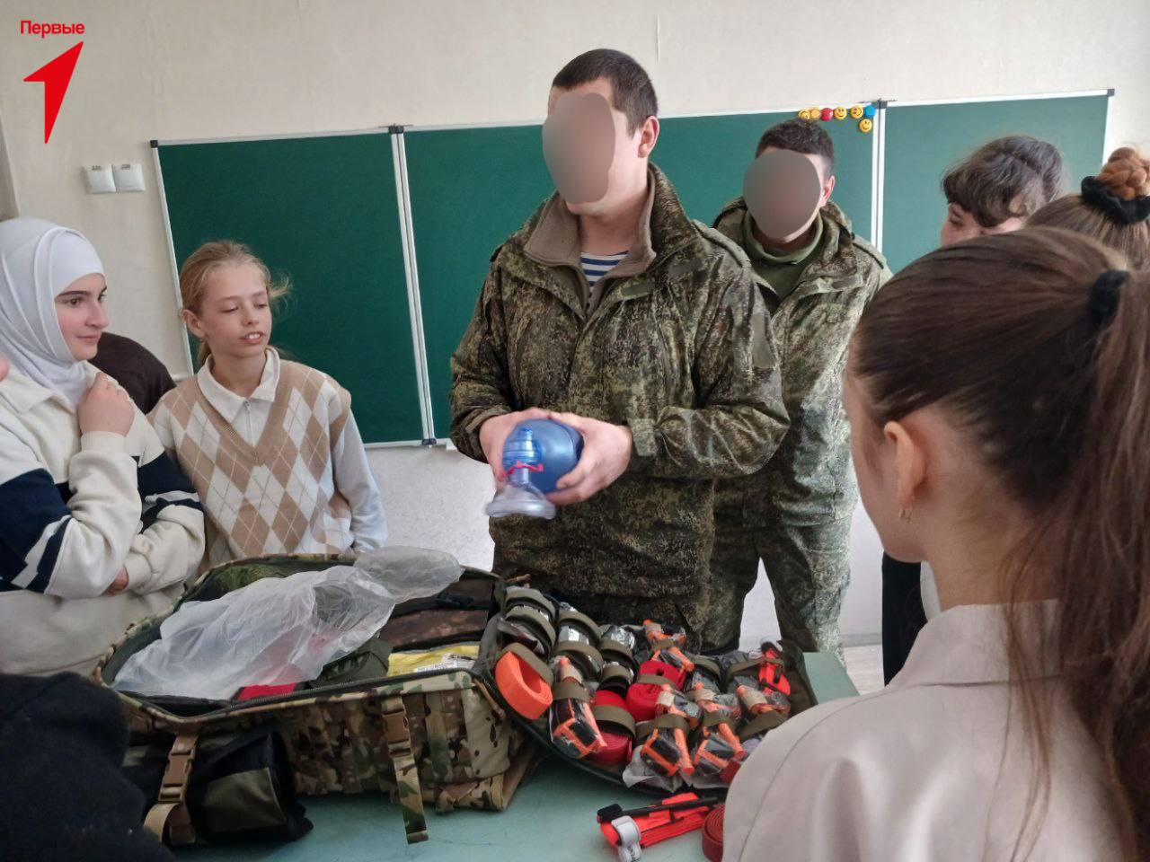 Школьникам подробно показали состав тактического рюкзака: они изучили препараты, перевязочные средства и все оборудование, которое необходимо главному военному медику. После теории ребята приступили к практике — сами учились накладывать жгуты и турникеты.