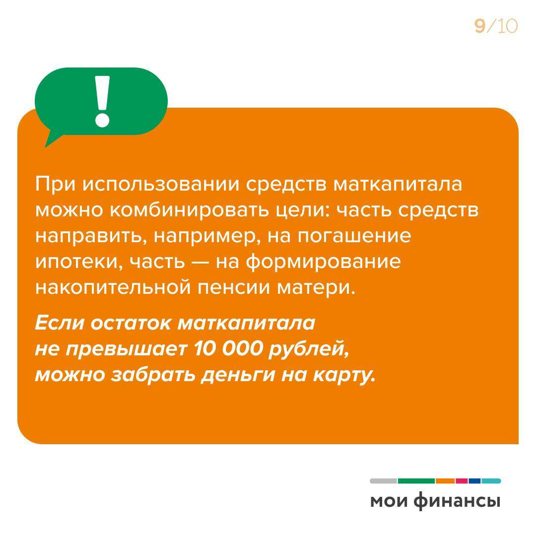Стоит отметить, что при использовании средств маткапитала можно комбинировать цели. При этом, если остаток маткапитала не превышает 10 000 рублей, можно забрать деньги на карту.